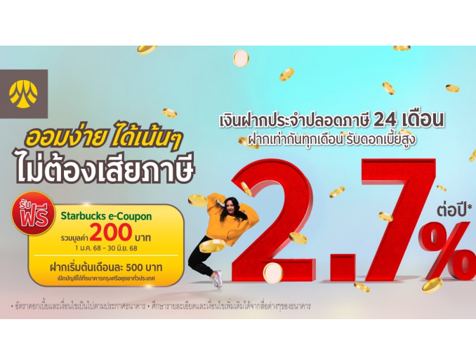 กรุงศรี (ธนาคารกรุงศรีอยุธยา จำกัด (มหาชน)) มอบสิทธิพิเศษสำหรับลูกค้าที่มีบัญชีเงินฝากประจำปลอดภาษี 24 เดือน ทั้งลูกค้าปัจจุบัน และลูกค้าที่เปิดบัญชีใหม่ตั้งแต่วันที่ 1 มกราคม 2568 – 30 มิถุนายน 2568 เพียงสมัครบริการตั้งโอนเงินล่วงหน้าผ่าน krungsri app และมีรายการตัดบัญชีสำเร็จ เพื่อฝากเข้าบัญชีเงินฝากประจำปลอดภาษีดังกล่าว ภายในวันที่ 31 กรกฎาคม 2568 จะได้รับ Starbucks e-Coupon รวมมูลค่า 200 บาท ผ่านทาง krungsri app