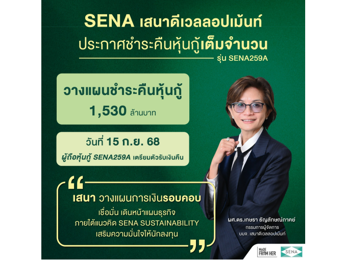 ในวันที่เศรษฐกิจยังมีความไม่แน่นอน แต่ “การเงินเสนา” ยังนิ่งและเป๊ะ! ดร.ยุ้ย – เกษรา ธัญลักษณ์ภาคย์ กรรมการผู้จัดการ บริษัท เสนาดีเวลลอปเม้นท์ จำกัด (มหาชน) ประกาศชำระคืนหุ้นกู้รุ่น SENA259A ครบทั้งจำนวน มูลค่า 1,530 ล้านบาท ในวันที่ 15 กันยายนนี้ ผู้ถือหุ้นกู้เตรียมตัวรับเงินคืน
