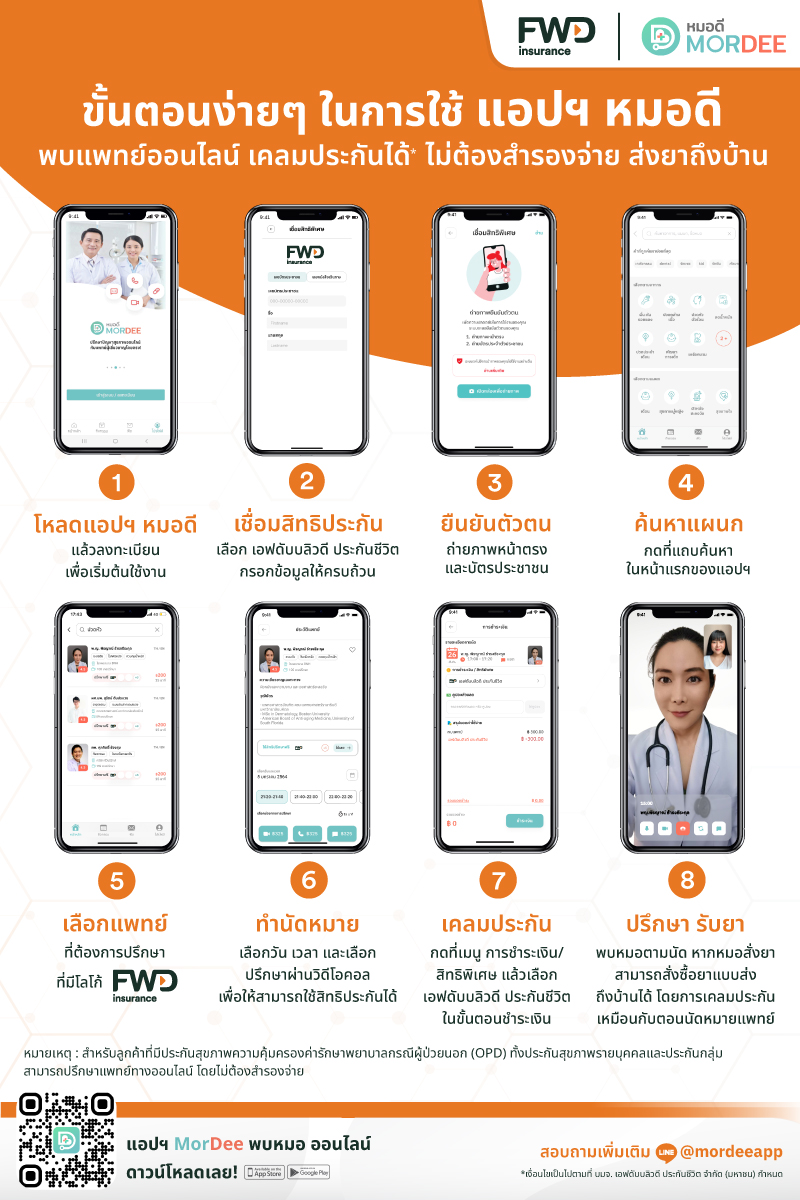 การเพิ่มทางเลือกใหม่ผ่านแอปพลิเคชัน MorDee (หมอดี) จึงเป็นอีกหนึ่งช่องทาง ที่ช่วยให้ลูกค้า FWD สามารถพบแพทย์ออนไลน์ได้อย่างสะดวกสบายจากทุกที่ ซึ่งใช้เวลาในทุกขั้นตอนตั้งแต่ลงทะเบียนจนถึงรับคำปรึกษาในเวลาไม่เกิน 30 นาที (ไม่รวมระยะเวลาจัดส่งยา)