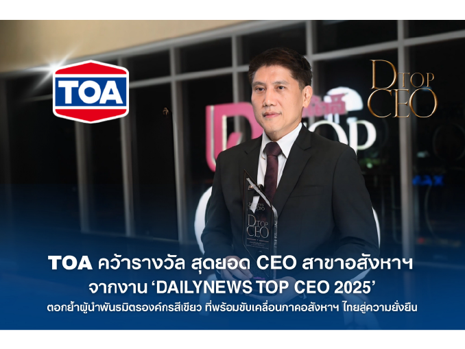 เมื่อวันที่ 19 กันยายน 2568 บริษัท ทีโอเอ เพ้นท์ (ประเทศไทย) จำกัด (มหาชน) หรือ TOA ประกาศความสำเร็จอีกครั้ง โดย จตุภัทร์ ตั้งคารวคุณ ประธานเจ้าหน้าที่บริหาร รับรางวัลเกียรติยศ สุดยอดผู้นำองค์กรในสาขาธุรกิจอสังหาริมทรัพย์ จากงาน 'DAILYNEWS TOP CEO 2025' จัดโดยเดลินิวส์ เพื่อยกย่องเชิดชูเกียรติให้กับผู้บริหารสูงสุดขององค์กรทั้งภาครัฐและเอกชน ที่มีความโดดเด่นในการบริหารจัดการด้านต่างๆ จนประสบความสำเร็จ ส่งผลให้เกิดประโยชน์ต่อภาพรวมทางเศรษฐกิจ สังคม และประเทศชาติ สะท้อนบทบาทสำคัญของ TOA ในฐานะผู้นำอุตสาหกรรมสี - เคมีภัณฑ์ก่อสร้าง และการเป็นพันธมิตรองค์กรสีเขียว ‘Green Partner’ ของภาคอสังหาฯ ไทย เพื่อเดินหน้าสู่ความยั่งยืน โดยมี ประพิณ รุจิรวงศ์, สิริวรรณ พันธุ์ปรีชากิจ กรรมการบริหารเดลินิวส์ พร้อมด้วย นต รุจิรวงศ์, นนท์ รุจิรวงศ์ และ นลิน รุจิรวงศ์ รองกรรมการผู้จัดการใหญ่ ฝ่ายกลยุทธ์องค์กรและการตลาด (EVP) ร่วมแสดงความยินดี ณ โรงแรมเซ็นทารา แกรนด์ แอท เซ็นทรัลเวิลด์