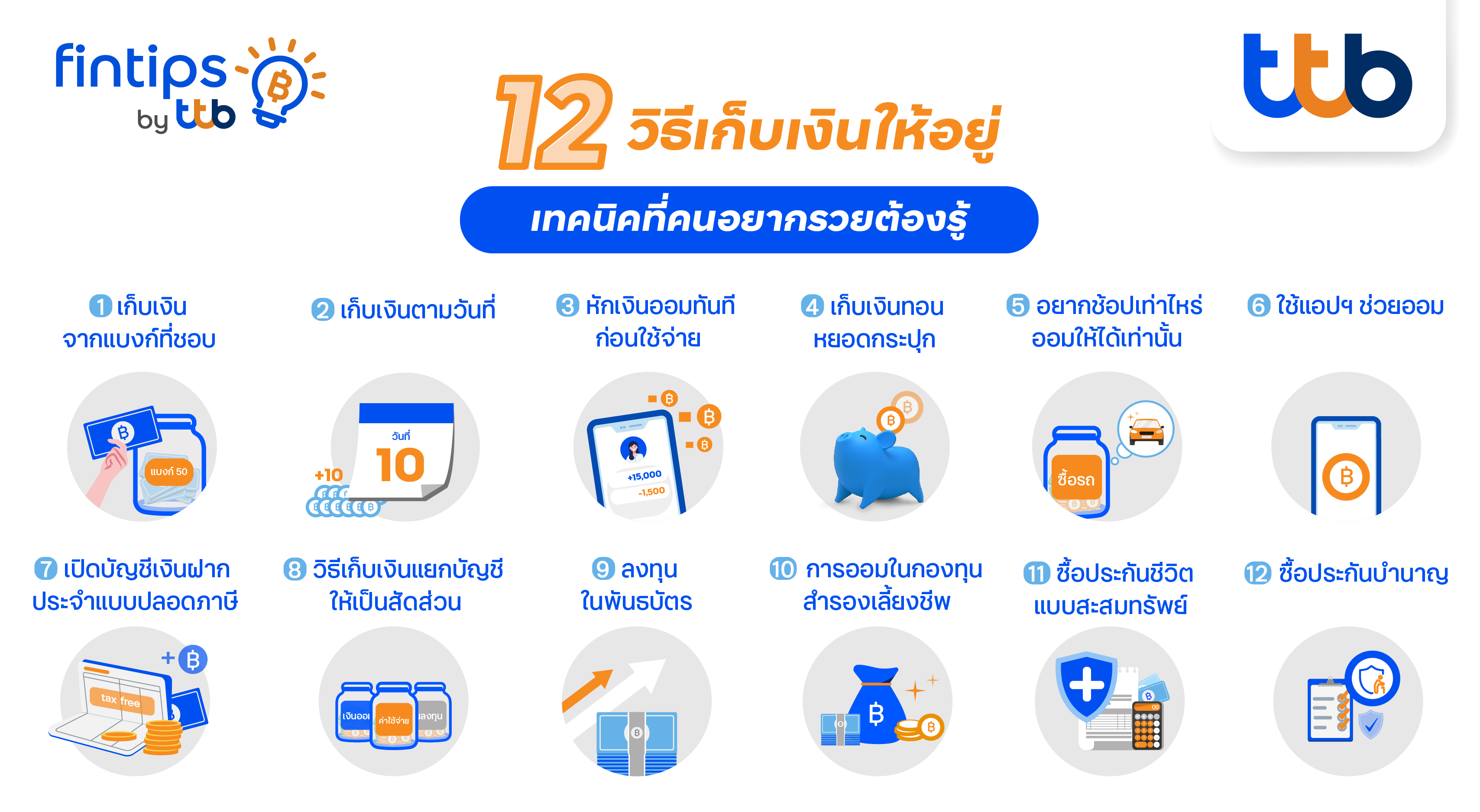 คลิกเพื่ออ่านบทความฉบับเต็มได้ที่ https://www.ttbbank.com/th/fin-tips/detail/deposits-12-money-saving-tips หรือ ติดตามเคล็ดลับการเงินอื่น ๆ จาก “fintips by ttb” เรื่องเงินที่รู้จริงแบบเพื่อนที่รู้ใจ คลิก https://www.ttbbank.com/link/fintips-pr