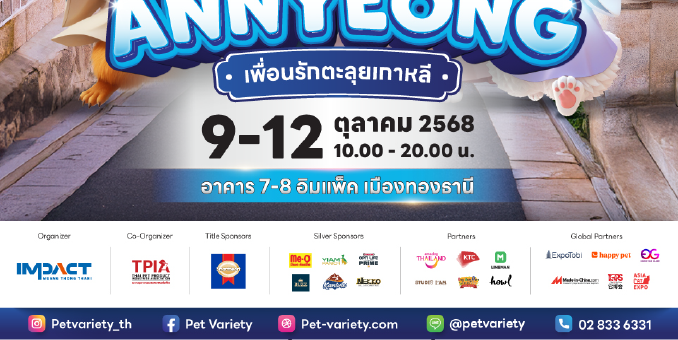 SmartHeart presents Thailand International Pet Variety Exhibition 2025 มหกรรมสัตว์เลี้ยงสุดยิ่งใหญ่กลับมาสร้างความสุขเป็นครั้งที่ 15 ภายใต้คอนเซปต์ “ANNYEONG เพื่อนรักตะลุยเกาหลี” ที่จำลองกลิ่นอายเกาหลีย้อนยุคมาไว้กลางอิมแพ็ค เมืองทองธานี ให้คนรักสัตว์พาเพื่อนซี้สี่ขามาสนุก ถ่ายรูปชิค ๆ และช้อปสินค้าเพลิน ๆ เหมือนบินไปโซลจริง! จัดเต็ม 4 วัน ระหว่างวันที่ 9–12 ตุลาคม 2568 ณ อาคาร 7–8 ศูนย์แสดงสินค้าและการประชุมอิมแพ็ค เมืองทองธานี พบกับสัตว์เลี้ยงนานาชนิดกว่า 20,000 ตัว และบูธสินค้า-บริการสัตว์เลี้ยงกว่า 250 บูธ ตั้งแต่แฟชั่น อาหาร ของเล่น จนถึงนวัตกรรมเทคโนโลยีล่าสุด พร้อมโปรโมชั่นพิเศษพร้อมสนุกไปกับกิจกรรมสุดมันส์และโซนไฮไลท์ที่ยกแลนด์มาร์กเกาหลีมาไว้ในงานเดียว!
