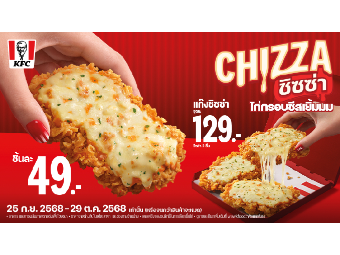 พลาดไม่ได้กับความอร่อยอีกขั้นของ ‘ชิซซ่า’ จาก KFC ได้ตั้งแต่ 25 กันยายน – 29 ตุลาคม 2568 เท่านั้น! ที่ร้าน KFC ทุกสาขา ทั่วประเทศ (ยกเว้นสาขาท่าอากาศยานดอนเมืองและสุวรรณภูมิ) รีบหน่อยมาช้าแล้วจะอดฟิน! ร่วมแชร์โมเมนต์ความอร่อย ผ่านแฮชแท็ก #KFC #Chizza #ชิซซ่า บนทุกแพลตฟอร์มโซเชียลมีเดีย พร้อมติดโปรโมชันสุดพิเศษและข่าวสารจาก KFC ได้ที่ Facebook @KFCThailand, TikTok @KFCThailand, Instagram @kfcthailand และ X @KFCThailand
