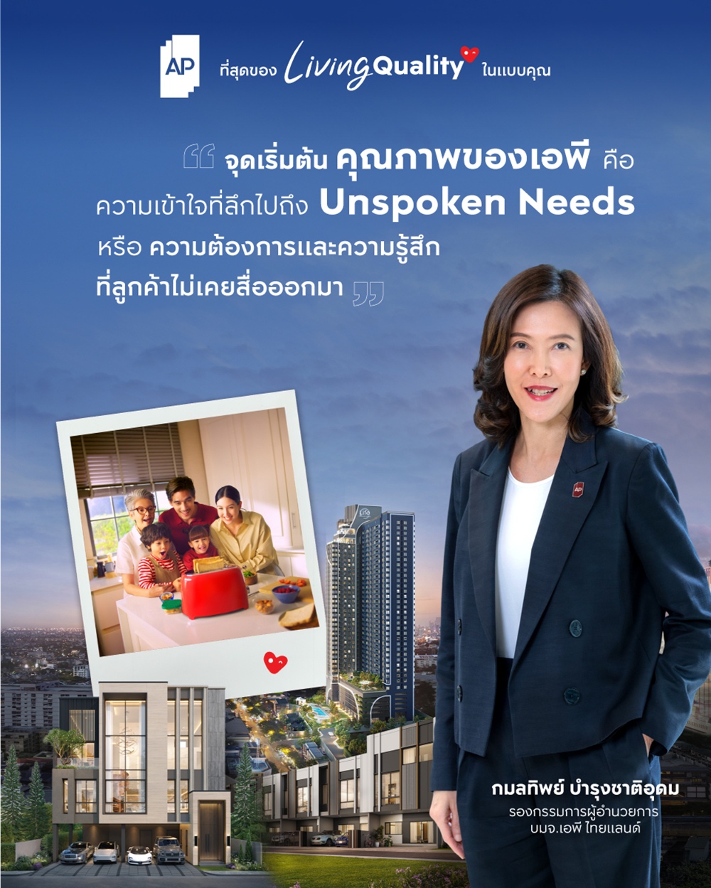 “จุดเริ่มต้นของคุณภาพในแบบของเอพี คือ ความเข้าใจ ซึ่งนอกจากการให้ความสำคัญในเรื่องงานออกแบบพื้นที่และการก่อสร้างที่ได้มาตรฐาน การเลือกใช้วัสดุคุณภาพที่แข็งแรงคงทน หรือการดูแลลูกค้าตลอด 24 ชม.แล้ว ความเข้าใจถึงคุณภาพชีวิตจริง (Living Quality) ที่เจาะลึกไปถึง Unspoken Needs – ความต้องการและความรู้สึกที่ไม่เคยสื่อออกมา เข้าใจทุกความต้องการที่หลากหลายที่ไม่ใช่แค่เรื่องของฟังก์ชันการใช้งาน แต่คือการเข้าใจอารมณ์ ความรู้สึก ความสบายใจ ความภูมิใจ ความรัก ความผูกพัน การได้เติบโต และการได้ใช้ชีวิตในแบบของตัวเอง เพื่อส่งเสริมให้ผู้อยู่อาศัยในโครงการเอพี มีคุณภาพชีวิตที่ดีในแบบของตัวเอง”