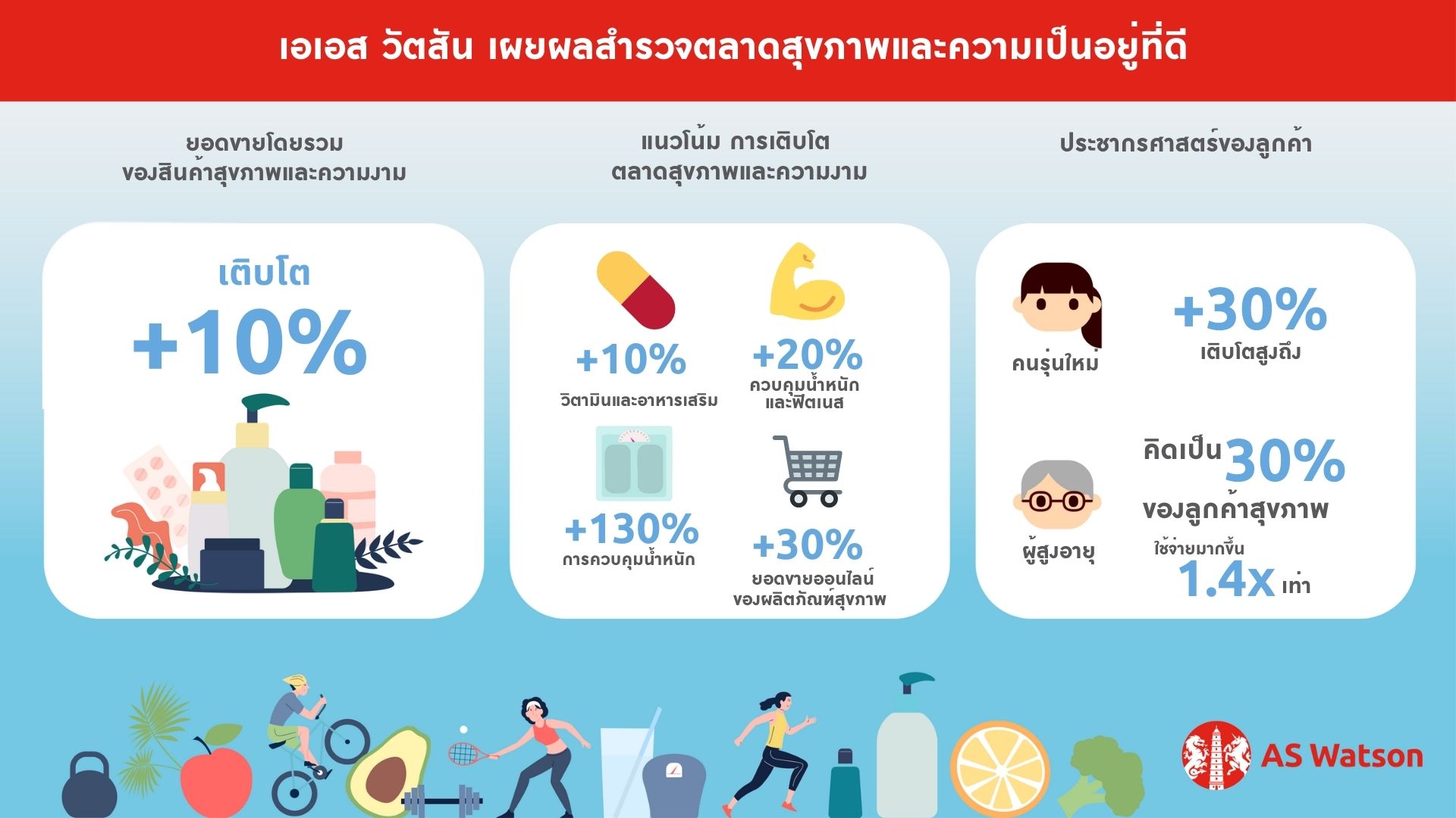 ธุรกิจด้านสุขภาพของเอเอส วัตสันยังคงเติบโตอย่างต่อเนื่อง ขับเคลื่อนด้วยพฤติกรรมของลูกค้าที่เปลี่ยนแปลงไป การให้ความสำคัญกับการดูแลเชิงป้องกันที่เพิ่มมากขึ้น และการเติบโตที่แข็งแกร่งของหมวดสินค้า ในช่วง 12 เดือนที่ผ่านมา ยอดขายโดยรวมของสินค้าสุขภาพและความงาม เพิ่มขึ้นกว่า 10% โดยหมวดวิตามินและอาหารเสริมก็เพิ่มขึ้นมากกว่า 10% เช่นกัน และหมวดหมู่ผลิตภัณฑ์ควบคุมน้ำหนักและฟิตเนส เพิ่มขึ้นอย่างน่าประทับใจกว่า 20%