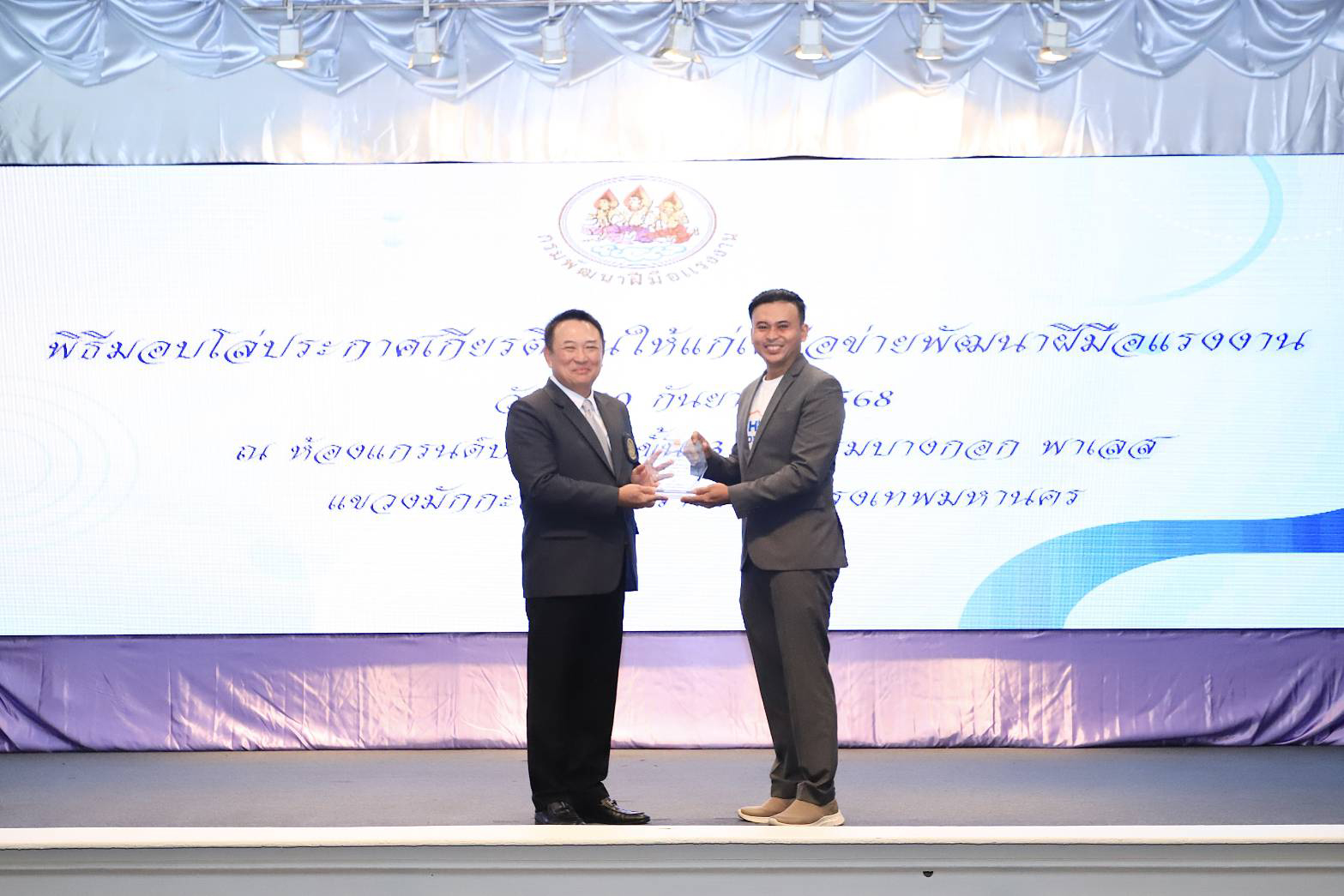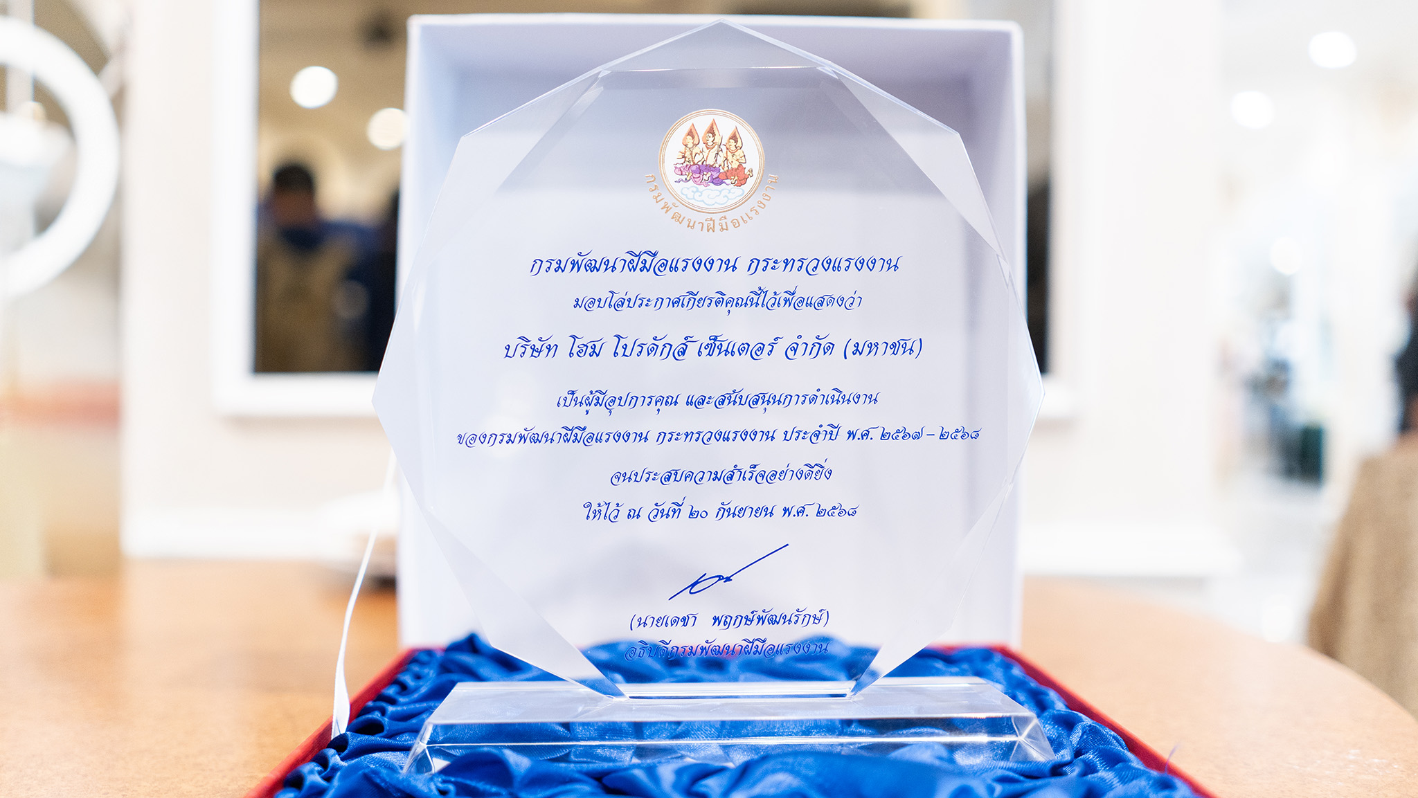 ธีรพล รอดเฉื่อย ผู้ช่วยกรรมการผู้จัดการ สายบริหารงานจัดส่งและติดตั้ง บริษัท โฮม โปรดักส์ เซ็นเตอร์ จำกัด (มหาชน) หรือ โฮมโปร เข้ารับมอบโล่เกียรติคุณ “เครือข่ายพัฒนาทักษะฝีมือแรงงาน” จากกรมพัฒนาฝีมือแรงงาน โดยมีนายเดชา พฤกษ์พัฒนรักษ์ อธิบดีกรมพัฒนาฝีมือแรงงาน เป็นประธานมอบโล่เกียรติคุณ