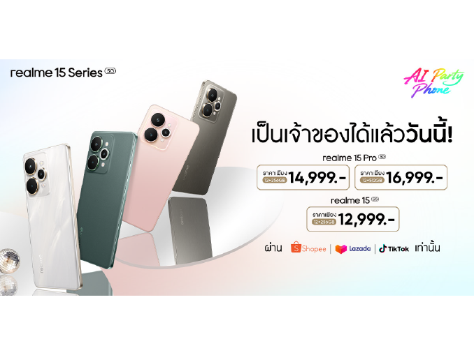 realme แบรนด์สมาร์ตโฟนเพื่อคนรุ่นใหม่ ประกาศวันวางจำหน่ายของ “realme 15 Series 5G” ในวันที่ 25 กันยายน ผ่านช่องทางอีคอมเมิร์ซ Shopee, Lazada และ Tiktok และ ในวันที่ 27 กันยายนนี้ ผ่าน realme Brand Shop ศูนย์จำหน่ายสมาร์ตโฟนชั้นนำ และศูนย์บริการโอเปอเรเตอร์ทั่วประเทศ ให้คุณเป็นเจ้าของ “AI Party Phone” ที่ยืนหนึ่งด้วย AI Edit Genie ฟีเจอร์แต่งภาพที่สั่งงานด้วยเสียงเป็นครั้งแรกของวงการ พร้อมจัดโปรโมชันสุดคุ้มจากโอเปอเรเตอร์ชั้นนำและพาร์ตเนอร์ทั้งหน้าร้านและออนไลน์
