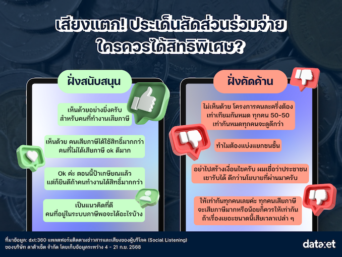 ฝั่งสนับสนุน: การวิเคราะห์บทสนทนาออนไลน์ พบว่ามีกลุ่มหนึ่งที่แสดงความเข้าใจและยอมรับแนวคิดการให้สิทธิพิเศษแก่ผู้เสียภาษี กลุ่มนี้มองว่าการปรับสัดส่วนการร่วมจ่ายนั้น มีความสมเหตุสมผล เป็นการตอบแทนพลเมืองที่ปฏิบัติหน้าที่เสียภาษีอย่างครบถ้วน และอาจเป็นการสร้างแรงจูงใจให้ประชาชนเข้าสู่ระบบภาษีมากขึ้น