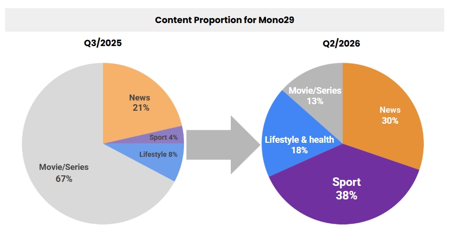 MONO29 จะปรับผังครั้งใหญ่ในเดือนพฤศจิกายน 2568 เป็นต้นไป เพิ่มสัดส่วน Sport Content จาก 4% เป็น 38% โดยครอบคลุมสิทธิ์การถ่ายทอดสดและรายการกีฬาระดับโลก เช่น พรีเมียร์ลีกอังกฤษ (EPL), The Emirates FA Cup, Carabao Cup, EFL Championship, League One, League Two, EFL Trophy, Ligue 1 (ฝรั่งเศส), European Qualifiers, Thai League รวมถึงคอนเทนต์พิเศษจาก LFCTV สำหรับแฟนลิเวอร์พูลและแฟนบอลไทย