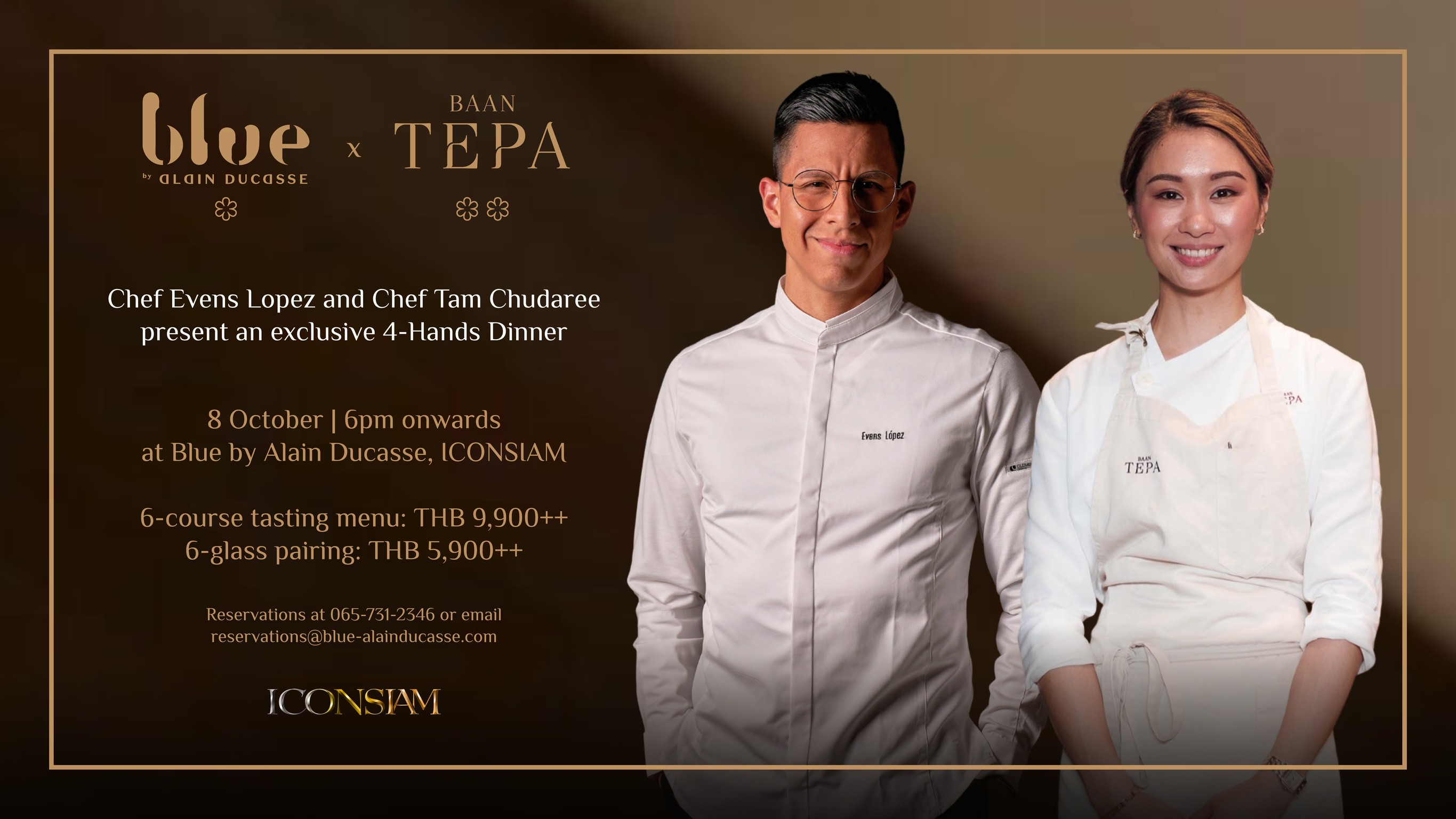 Blue by Alain Ducasse ร้านอาหารฝรั่งเศสไฟน์ไดนิ่งระดับหนึ่งดาวมิชลิน เปิดมิติใหม่ด้านรสชาติ นำเสนอมื้ออาหารสุดเอ็กซ์คลูซีฟ “Blue by Alain Ducasse x Baan Tepa 4-Hands Dinner” จากการร่วมมือของสองสุดยอดเชฟระดับโลก เชฟอีเวนส์ โลเปซ (Evens Lopez) Executive Chef แห่ง Blue by Alain Ducasse ร้านอาหารฝรั่งเศสไฟน์ไดนิ่งรางวัลมิชลิน 1 ดาว 5 ปีซ้อน และ เชฟตาม-ชุดารี เทพาคำ เจ้าของร้านอาหาร “บ้านเทพา” ร้านอาหารไทยไฟน์ไดนิ่งระดับมิชลิน 2 ดาว ผู้คว้ารางวัล Asia's Best Female Chef 2025 จาก Asia's 50 Best Restaurant ปีล่าสุด ที่จะร่วมกันรังสรรค์ดินเนอร์สุดพิเศษ ให้ได้สัมผัสรสชาติอาหารชั้นเลิศได้ลิ้มลอง ในวันพุธที่ 8 ตุลาคม 2568 ณ ร้าน Blue by Alain Ducasse ชั้น 1 ไอคอนสยาม
