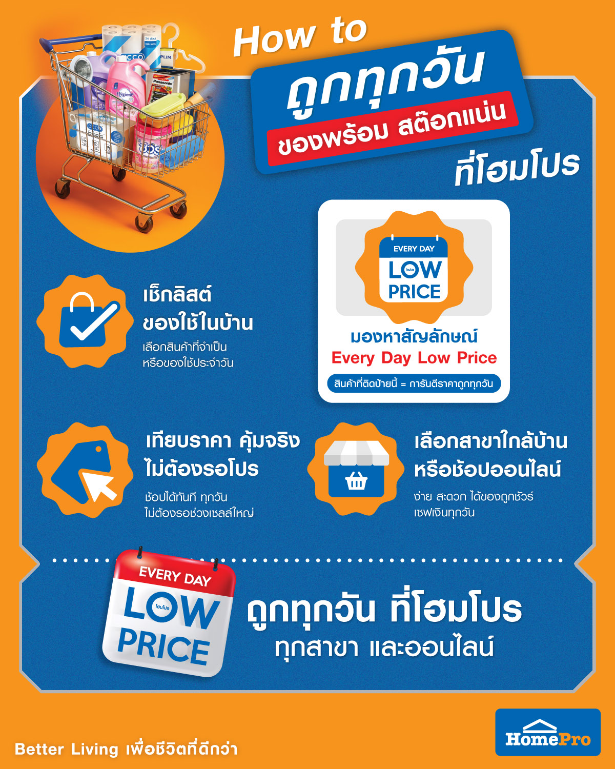เพื่อให้ทุกคนสัมผัสความคุ้มค่าได้ทุกช่องทางอย่างเท่าเทียม ไม่ว่าจะเลือกช้อปที่โฮมโปรสาขาใกล้บ้าน โดยมองหาป้าย “Every Day Low Price” หรือ เลือกซื้อผ่านแพลตฟอร์มออนไลน์ของโฮมโปร ที่มีสัญลักษณ์เดียวกัน เพื่อช่วยให้ค้นหาสินค้าราคาดีได้ง่ายและรวดเร็ว ตอบโจทย์ไลฟ์สไตล์การช้อปของคนรุ่นใหม่ที่ต้องการความสะดวกและมั่นใจได้ว่าจะคุ้มค่าทุกครั้งที่ช้อป