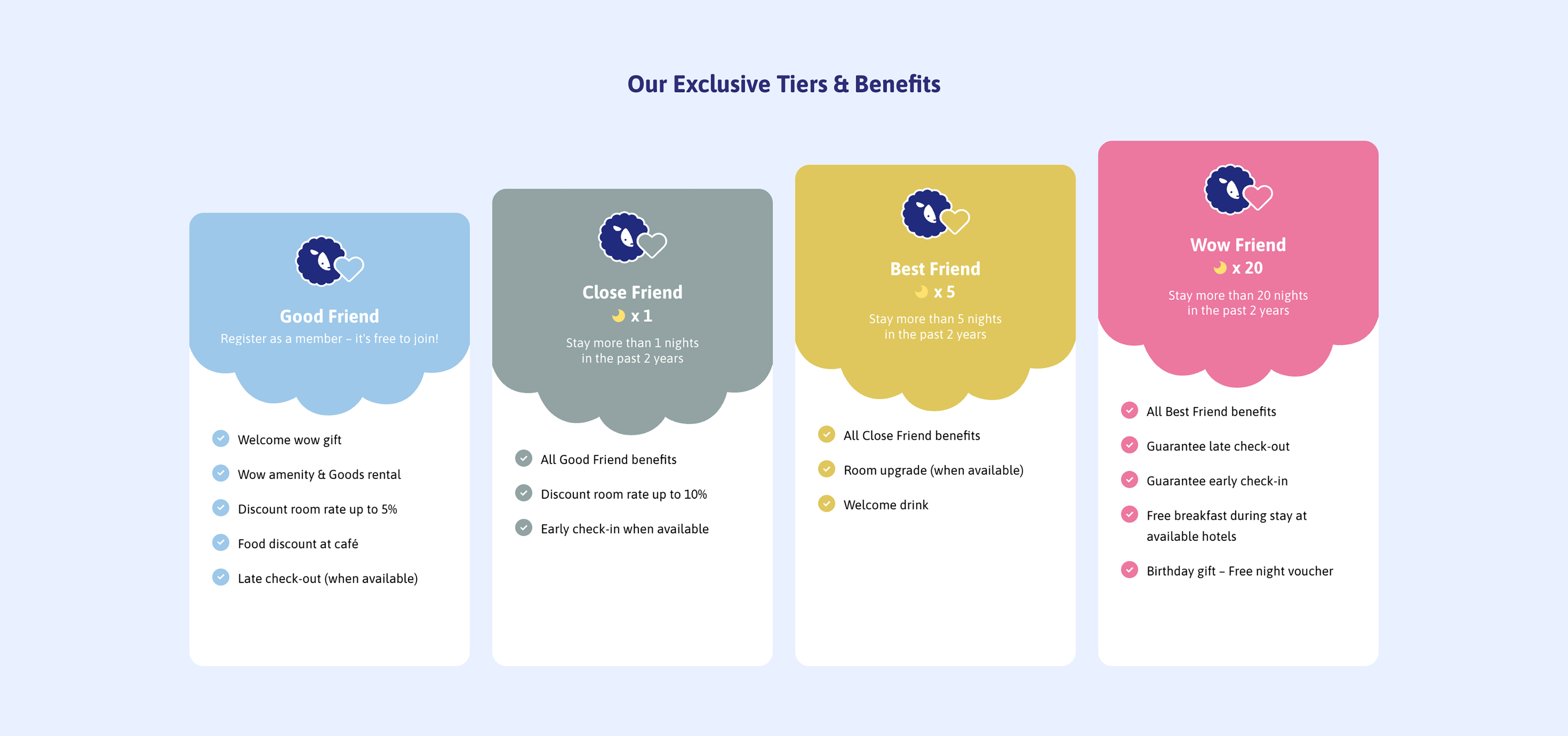 KokoFriends ดำเนินการในรูปแบบระบบสมาชิกแบบแบ่งระดับ โดยมอบสิทธิประโยชน์แก่ผู้เข้าพักที่จองโดยตรงและกลับมาใช้บริการเป็นประจำ การสมัครสมาชิกไม่มีค่าใช้จ่าย โดยสิทธิประโยชน์จะเพิ่มขึ้นตามแต่ละระดับ