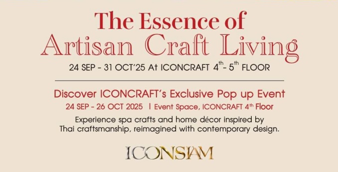 ไอคอนคราฟต์ (ICONCRAFT) พื้นที่แห่งแรงบันดาลใจ แหล่งรวมงานคราฟต์สร้างสรรค์จากช่างฝีมือไทยที่ใหญ่ที่สุด ชวนคนรักบ้านสัมผัสเสน่ห์ของแต่งบ้านและผลิตภัณฑ์สปาสุดคราฟต์ ที่ผสานความงามเข้ากับประโยชน์ใช้สอยอย่างลงตัว ในแคมเปญ “THE ESSENCE OF ARTISAN CRAFT LIVING” รวบรวมเฟอร์นิเจอร์และของแต่งบัานแบรนด์ไทย ดีไซน์พิถีพิถัน ฟังก์ชันตอบโจทย์ มาให้เลือกสรร พร้อมผลิตภัณฑ์ Spa at Home ที่จะสร้างบรรยากาศแห่งความผ่อนคลายให้ทุกมุมของบ้าน เพื่อเติมเต็มแรงบันดาลใจในการแต่งบ้านและการพักผ่อนให้กับทุกคน ตั้งแต่วันนี้ถึง 26 ตุลาคม 2568 ณ Pop-up Event Space ไอคอนคราฟต์ ชั้น 4 ไอคอนสยาม