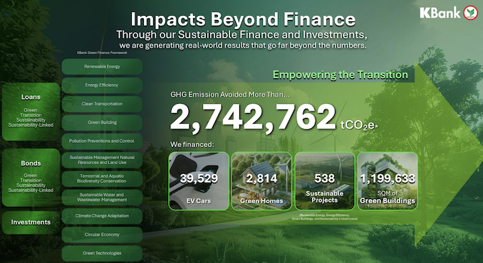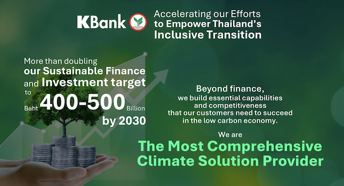 ธนาคารได้ปรับเป้าหมายสินเชื่อและเงินลงทุนเพื่อความยั่งยืน เป็น 4-5 แสนล้านบาท ภายในปี 2573 (ค.ศ.2030) เพื่อเร่งการเปลี่ยนผ่านสู่เศรษฐกิจคาร์บอนต่ำอย่างมีประสิทธิภาพ ตลอดจนมุ่งมั่นพัฒนา Beyond Banking Solution เพื่อส่งมอบ Climate Solution ที่จะช่วยเสริมสร้างศักยภาพให้แก่ลูกค้า และส่งเสริมการสร้าง Carbon Ecosystem ที่ครอบคลุมทุกมิติของการแก้ไขปัญหาสภาพภูมิอากาศ ได้แก่ การเป็นที่ปรึกษาด้านความยั่งยืนและการลดการปล่อยก๊าซเรือนกระจกสำหรับภาคธุรกิจที่ต้องการปรับตัว พร้อมพัฒนาเครื่องมือ KClimate1.5 สำหรับการจัดทำบัญชีก๊าซเรือนกระจก การจัดตั้ง Creative Climate Research Center เป็นศูนย์กลางองค์ความรู้และความร่วมมือเพื่อรับมือกับปัญหาโลกร้อน การริเริ่มโครงการต่างๆ เพื่อสร้าง Carbon Ecosystem ในสังคม เช่น Watt’s Up แพลตฟอร์มสำหรับรถมอเตอร์ไซค์ไฟฟ้า แพลตฟอร์ม Green Pass สำหรับการขอใบรับรอง RECs และแพลตฟอร์ม K-GreenSpace ที่ช่วยให้ลูกค้าเข้าถึงโซลูชัน Green Living ได้ง่ายขึ้น