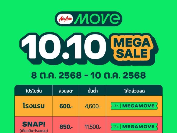 เพื่อตอบโจทย์ความต้องการเดินทางในช่วงไฮซีซัน AirAsia MOVE เปิดตัวแคมเปญ 10.10 Mega Sale ระหว่างวันที่ 8–10 ตุลาคม 2568 พร้อมดีลพิเศษ ดังนี้: