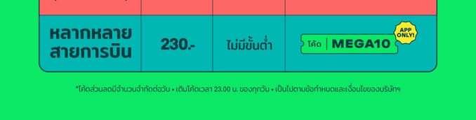 ● Fly Beyond – APP Exclusive: ดีลพิเศษเฉพาะในแอป ลดทันที 230 บาท ทุกเส้นทาง (โค้ด: MEGA10, ไม่มียอดขั้นต่ำ) ครอบคลุมกว่า 700 สายการบินอาทิ Bangkok Airways, Lao Airlines, Myanmar Airways International, Vietnam Airlines และอื่น ๆ อีกเพียบ! *เฉพาะสายการบินอื่นนอกเหนือจาก AirAsia บน AirAsia MOVE เท่านั้น • เป็นไปตามข้อกำหนดและเงื่อนไขของบริษัทฯ