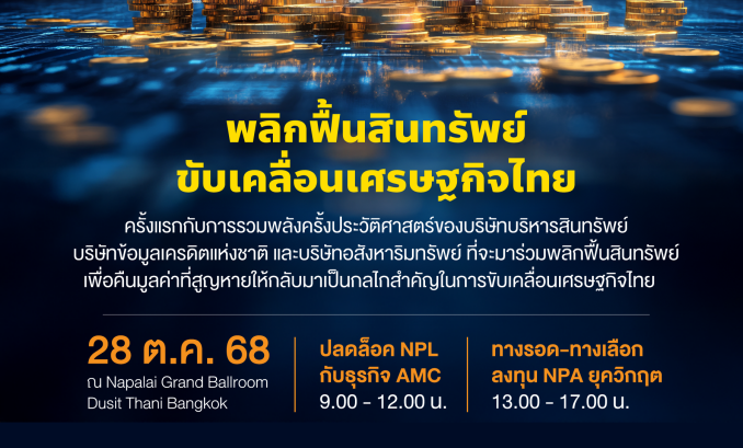 มาร่วมแสดงวิสัยทัศน์ในการ บริหารจัดการหนี้เสีย (NPLs) และ ลงทุนในทรัพย์สินรอการขาย (NPAs) ในมิติใหม่ เพื่อขับเคลื่อนระบบเศรษฐกิจไทยให้เติบโตอย่างยั่งยืน