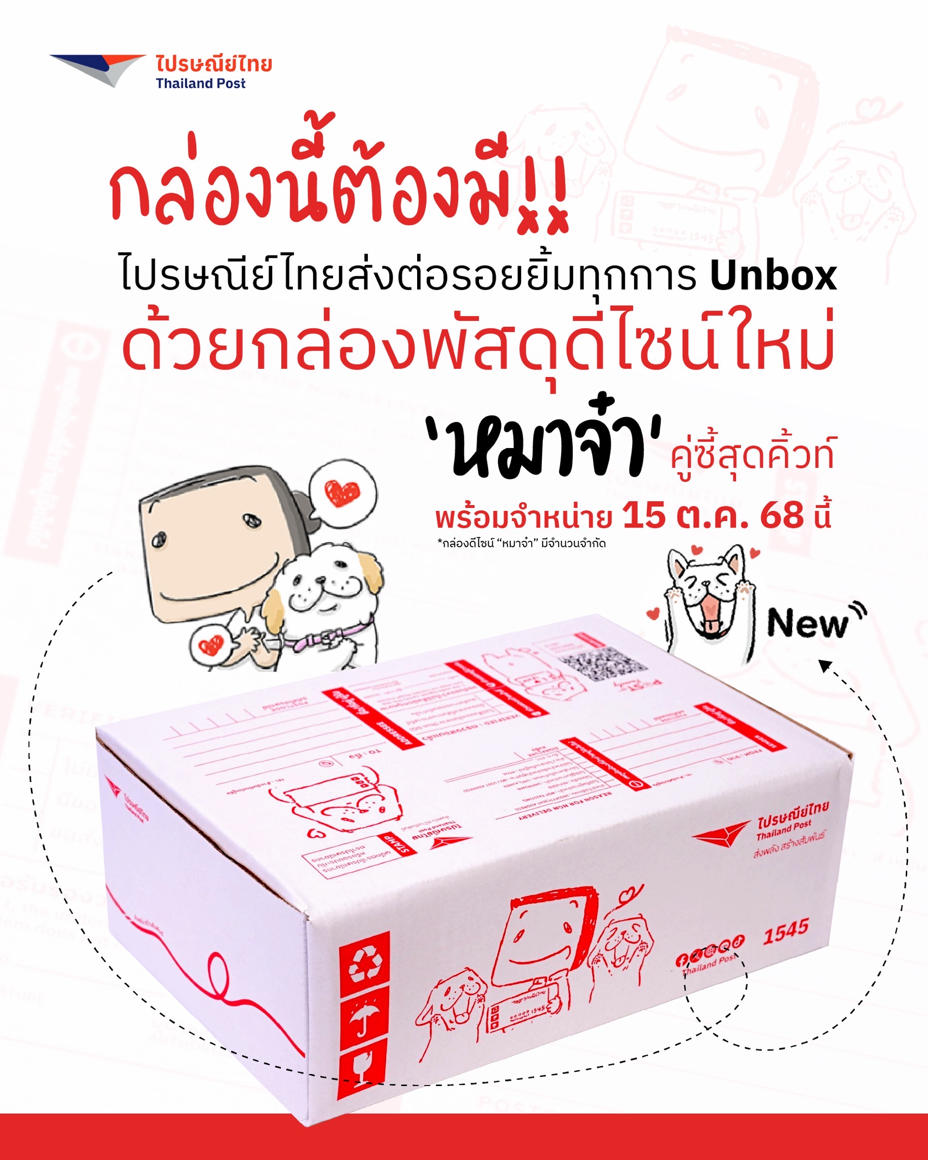 บริษัท ไปรษณีย์ไทย จำกัด เดินหน้าส่งต่อความสุขผ่านทุกการส่งพัสดุ เปิดตัวคอลแลบพิเศษกับเพจดัง “หมาจ๋า (Dogplease)” เจ้าของคาแรกเตอร์สุนัขแสนอบอุ่นขวัญใจโลกออนไลน์ สู่ผลงานดีไซน์สุดพิเศษ “กล่องไปรษณีย์ลายหมาจ๋า รุ่นลิมิเต็ด เอดิชัน” ภายใต้คอนเซปต์ “คู่หู คู่ซี้ Post & Paw Collection” ถ่ายทอดเรื่องราวแห่งมิตรภาพระหว่างพี่ไปรฯ กับเพื่อนซี้สี่ขา ที่อยู่เคียงข้างกันในทุกการเดินทางของพัสดุและทุกความรู้สึกที่ส่งถึงกัน