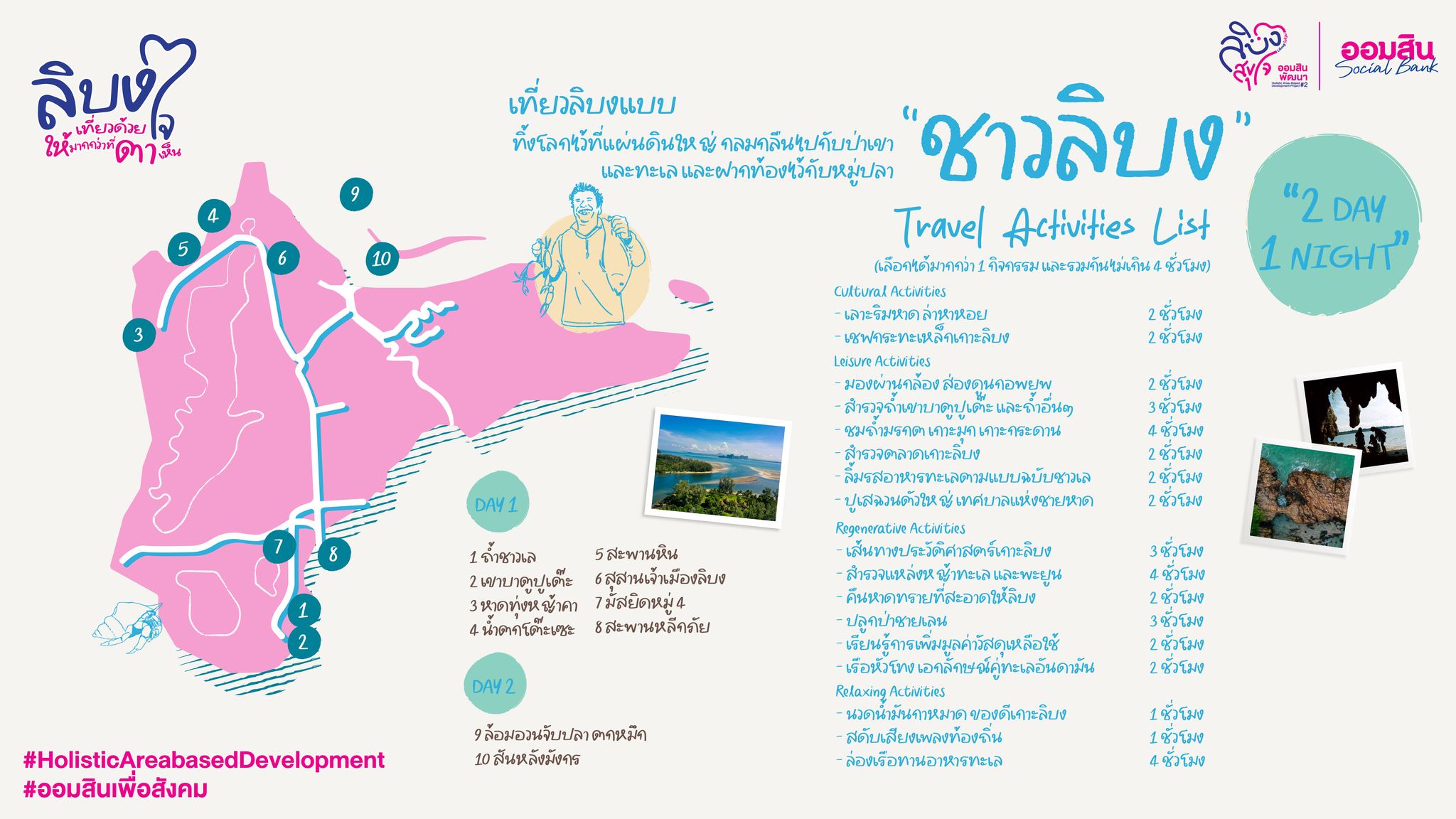 โดยให้เยาวชนเป็นผู้ถ่ายทอดเรื่องราว (Storytelling) ตลอดจนยกระดับผลิตภัณฑ์และภูมิปัญญาท้องถิ่น และส่งเสริมการตลาดของกลุ่มอาชีพ ศึกษารายละเอียดเพิ่มเติมเกี่ยวกับเส้นทางท่องเที่ยวเกาะลิบงได้ที่เฟซบุ๊กเพจ GSB Society