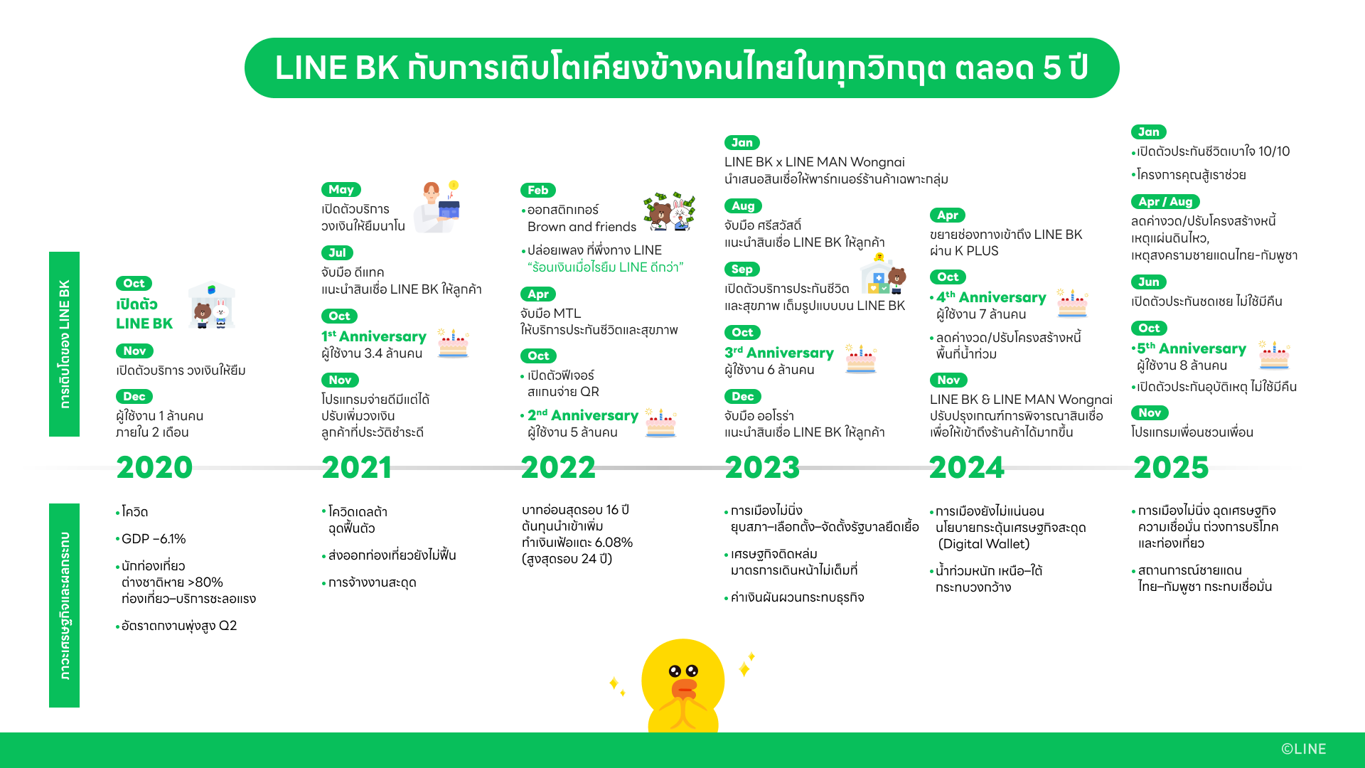นับตั้งแต่เปิดให้บริการในช่วงวิกฤตโควิด-19 LINE BK ยืนหยัดเคียงข้างคนไทยในทุกสถานการณ์ ตั้งแต่มาตรการช่วยเหลือลูกหนี้ การปรับโครงสร้างหนี้ และโครงการ “คุณสู้ เราช่วย” ตลอดจนปล่อยสินเชื่ออย่างรับผิดชอบ (Responsible Lending) เพื่อให้ลูกค้าเข้าถึงแหล่งเงินทุนในระบบโดยไม่ก่อหนี้เกินตัว