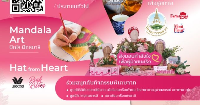 ขอเชิญชวนประชาชนทั่วไปเข้าร่วมกิจกรรม ‘Pink Bloom’ เรียนรู้สุขภาพกายและใจ ให้ห่างจากโรคมะเร็งเต้านม แนะนำการใช้แอพคัดกรองมะเร็ง, ART THERAPY บำบัดใจ รู้จักอารมณ์ บริหารความคิด ผ่านการสร้างสรรค์งานศิลปะ โดยนักศิลปะบำบัดวิชาชีพ IPATT (International Program of Art Therapy in Thailand), กิจกรรมระบายสี Mandala Art ฝึกสมาธิ ผ่อนคลายความเครียด, กิจกรรมประดิษฐ์หมวกสวย ใจสวย Hat from Heart มอบสู่ผู้ป่วยโรคมะเร็ง, FOOD THERAPY จิบชาสูตรพิเศษฟรี และชมผลิตภัณฑ์จากโครงการหลวง พร้อมรับฟรีแซนด์วิชโฮลวีตจากฟาร์มเฮ้าส์  และน้ำแร่เพื่อสุขภาพมองต์เฟลอ