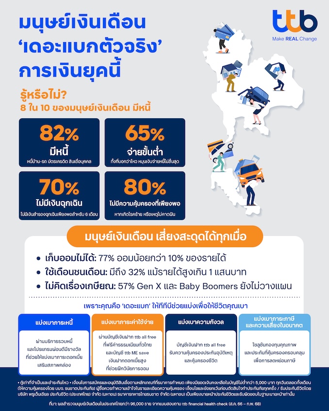 ทีเอ็มบีธนชาต (ทีทีบี) เปิดข้อมูลเชิงลึกครั้งแรกในงาน “เปิด Insight มนุษย์เงินเดือน เดอะแบกตัวจริง การเงินยุคนี้” สะท้อนสถานการณ์การเงินของมนุษย์เงินเดือนในประเทศไทยที่น่าห่วง หลังผลสำรวจ ttb financial health check จากกลุ่มตัวอย่างกว่า 96,000 คน พบว่า 82% มีภาระหนี้สิน โดยกว่าครึ่งเป็นหนี้บัตรเครดิตและสินเชื่อส่วนบุคคล ขณะเดียวกัน 49% มีหนี้สะสมจากการจ่ายขั้นต่ำหรือผิดนัดชำระ และอีก 65% แม้ยังจ่ายไหว แต่ยังคงชำระเพียงขั้นต่ำ ทำให้ติดอยู่ในวงจรหนี้ที่ไม่สิ้นสุด