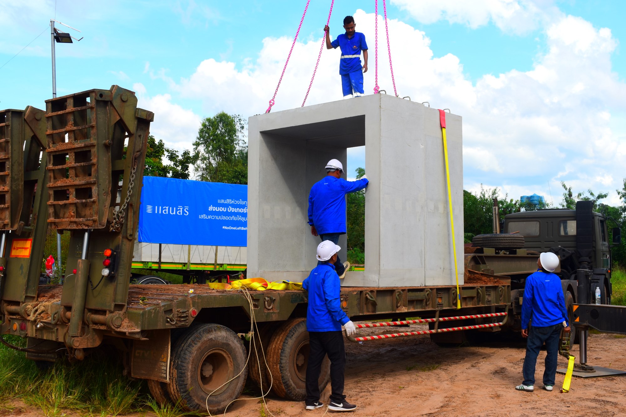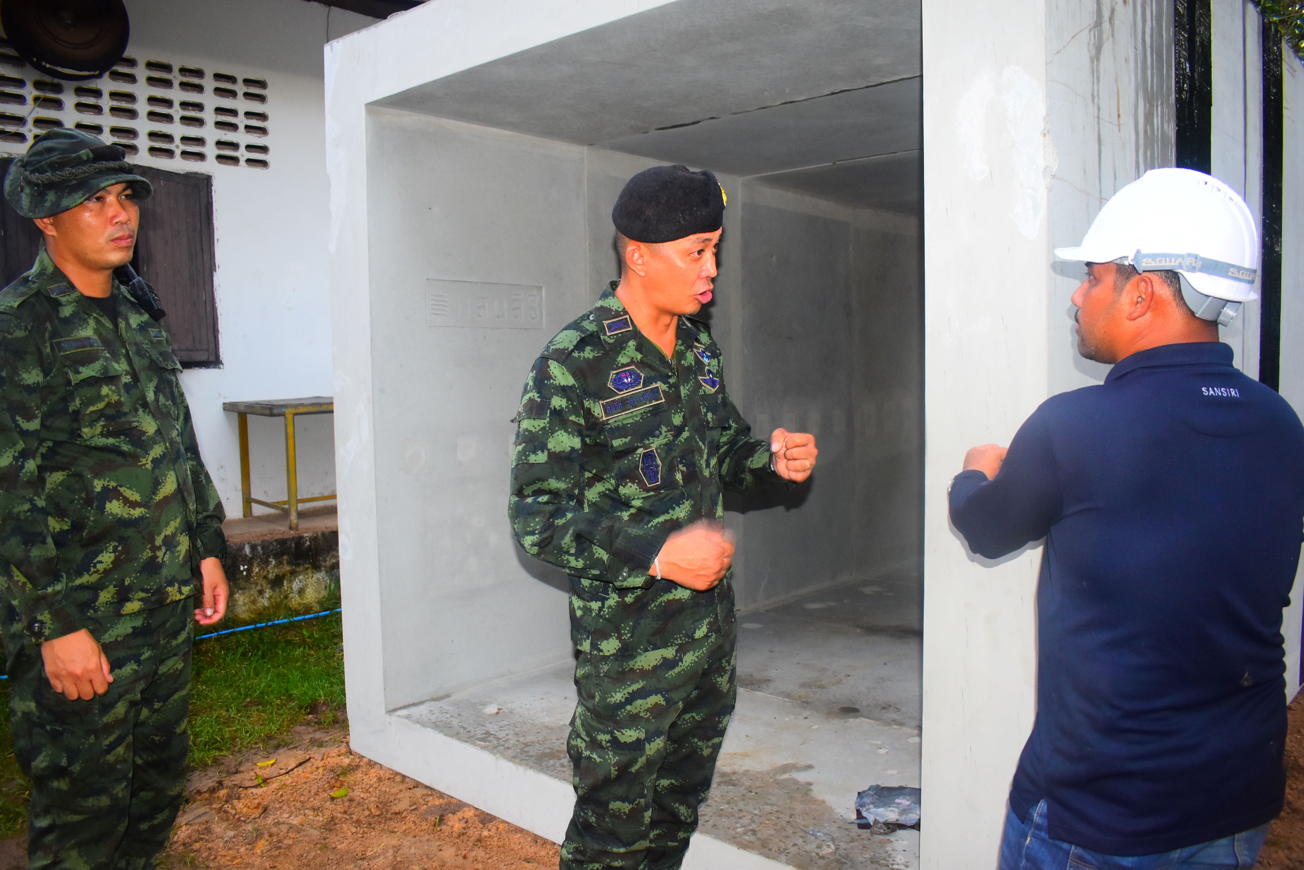 ภารกิจสำคัญครั้งนี้ สานต่อจากการลงพื้นที่ครั้งก่อน ทีมจิตอาสาแสนสิริและทีมติดตั้งจากโรงงานพรีคาสท์ ได้เร่งดำเนินการนำบังเกอร์ไปติดตั้งให้กับชุมชนในจังหวัดอุบลราชธานี โดยบังเกอร์ชุดนี้ไม่ได้เป็นเพียงที่กำบังทั่วไป แต่ถูกพัฒนาขึ้นด้วย เทคโนโลยีล่าสุดจากโรงงานพรีคาสท์ของแสนสิริ โดยใช้ "แผ่นกรีนพรีคาสท์ (Green Precast)" ซึ่งเป็นแผ่นคอนกรีตสำเร็จรูปเสริมเหล็กที่ถูกพัฒนาขึ้นเป็นพิเศษ ที่มีความทนทานต่อแรงกระแทกสูง ด้วยโครงสร้างที่แน่นหนาและเสริมเหล็กอย่างเป็นระบบ ทำให้สามารถรับมือกับแรงสั่นสะเทือนหรือแรงระเบิดในระยะไกลได้อย่างมีประสิทธิภาพ เป็นมิตรต่อสิ่งแวดล้อมและผู้ใช้งาน ช่วยลดอุณหภูมิความร้อนภายใน ทำให้ทหารสามารถปฏิบัติหน้าที่ได้อย่างสะดวกขึ้น และที่สำคัญคือความรวดเร็วในการติดตั้ง ด้วยระบบการเชื่อมต่อที่ออกแบบมาโดยเฉพาะ ทำให้การประกอบบังเกอร์ทั้งหมดนี้ใช้เวลาเพียงหนึ่งสัปดาห์ และในอนาคตยังสามารถปรับเปลี่ยนเป็นที่พักอาศัยหรือการใช้งานอื่นๆ ได้