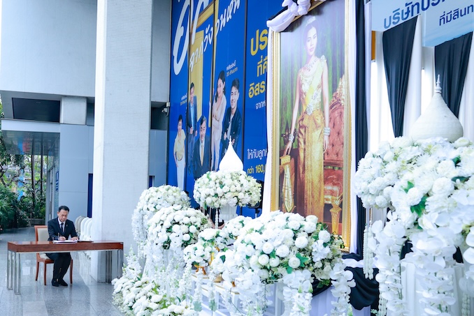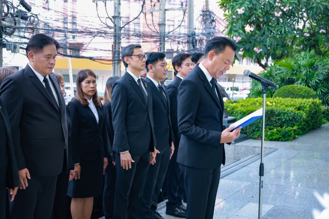 พร้อมยืนสงบนิ่งเป็นเวลา 93 วินาที และร่วมลงนาม ถวายความอาลัย เพื่อแสดงความจงรักภักดีและน้อมสำนึกในพระมหากรุณาธิคุณอันหาที่สุดมิได้ ด้วยพระเมตตาที่ทรงมีต่อพสกนิกรชาวไทยทุกหมู่เหล่า อันแผ่ไพศาลและเป็นที่ประจักษ์ตลอดมา ณ บริษัทบริหารสินทรัพย์ กรุงเทพพาณิชย์ จำกัด (มหาชน) สำนักงานใหญ่