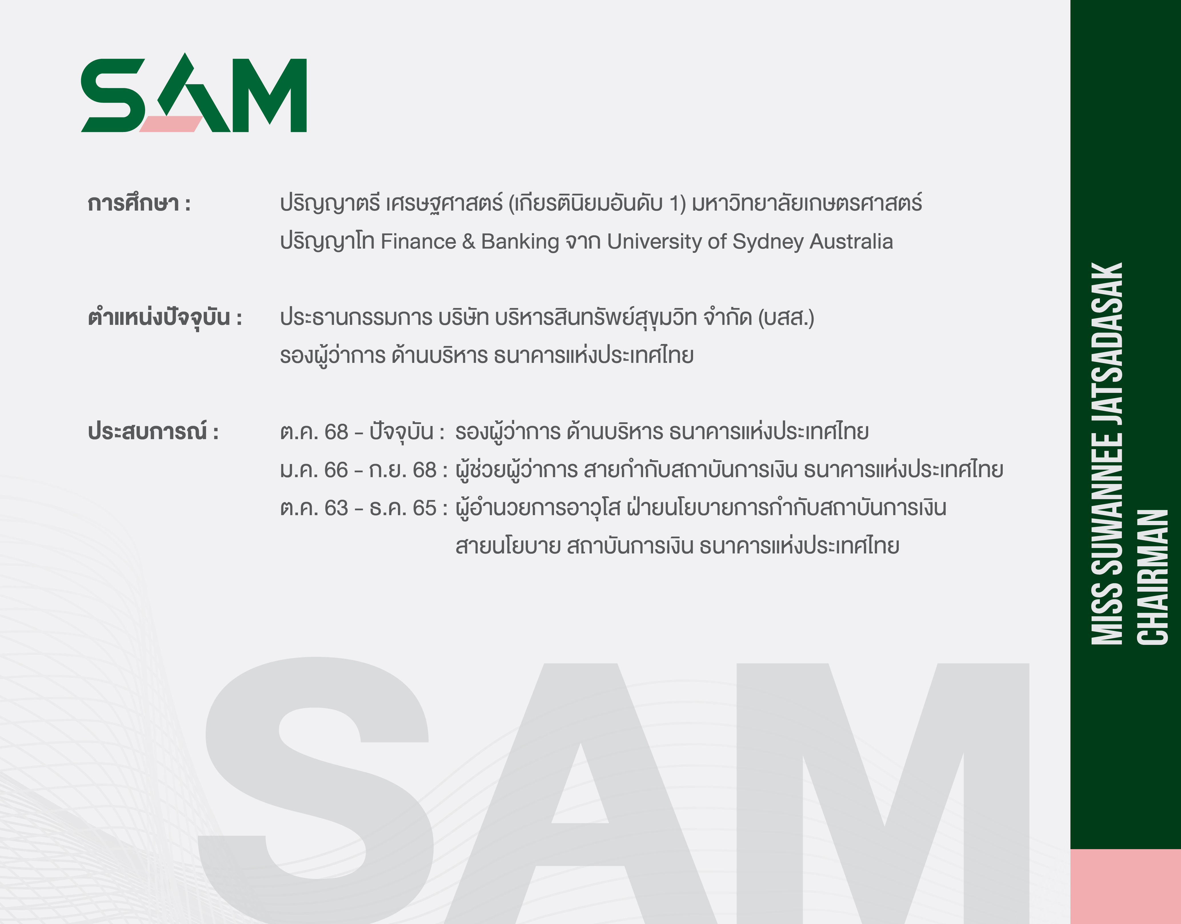 คณะกรรมการบริษัท บริหารสินทรัพย์สุขุมวิท จำกัด (บสส.) หรือ SAM มีมติแต่งตั้ง “สุวรรณี เจษฎาศักดิ์” รับตำแหน่งประธานบอร์ด SAM คนใหม่ มีผลตั้งแต่วันที่ 1 พฤศจิกายน 2568