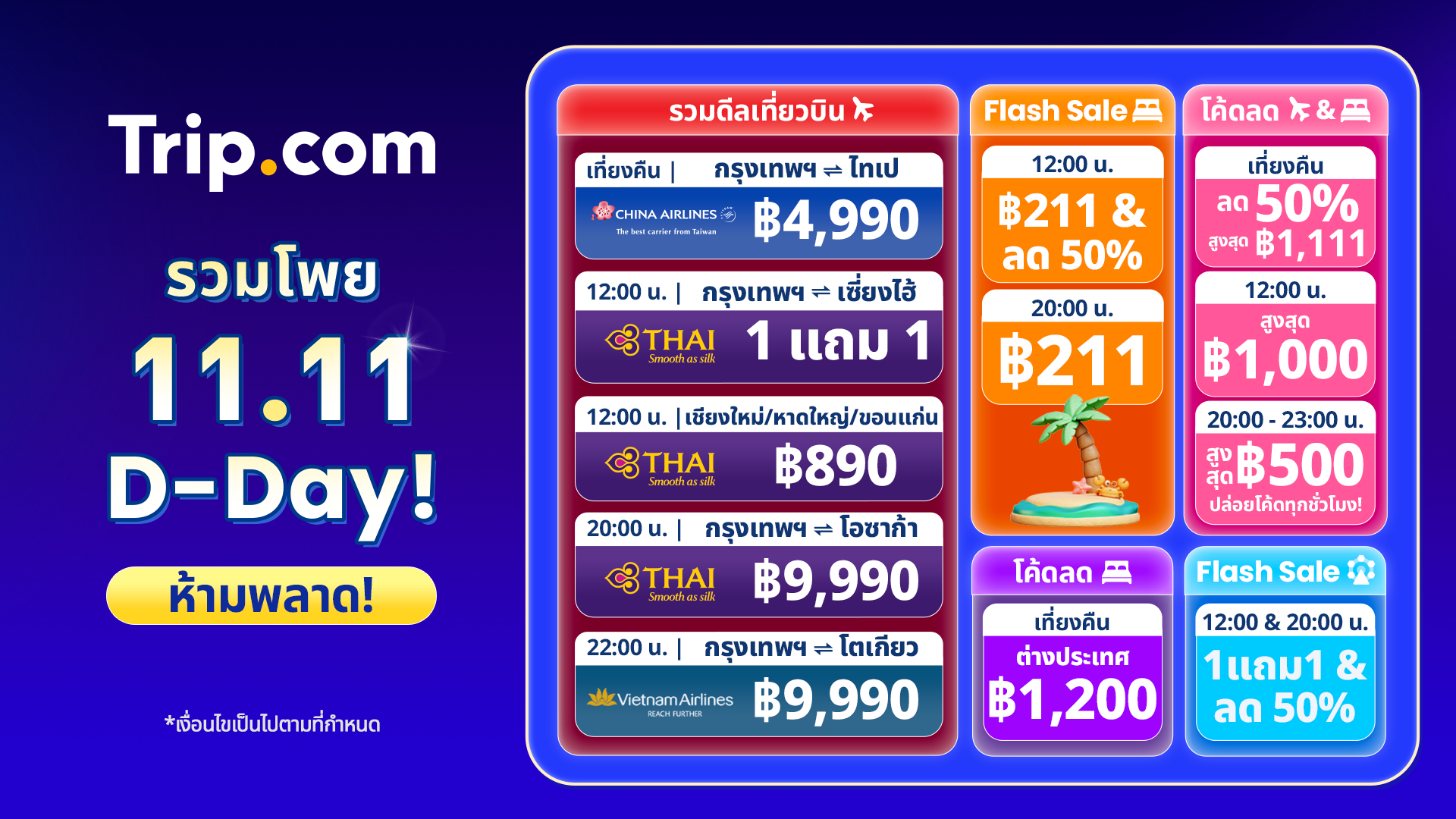 Trip.com เตรียมมอบข้อเสนอพิเศษเพื่อรองรับทุกความต้องการของนักเดินทาง เริ่มต้นด้วยดีลโรงแรมราคาสุดคุ้มเพียง 211 บาท* สำหรับที่พักที่ร่วมรายการ นอกจากนี้ยังมี โปรโมชั่นตั๋วเครื่องบิน Flash Sale ตลอดวันที่ 11 พฤศจิกายน 2568 โดยจัดเป็นรอบ ๆ เพื่อให้ลูกค้าสามารถเข้าถึงดีลได้หลายช่วงเวลา เช่น