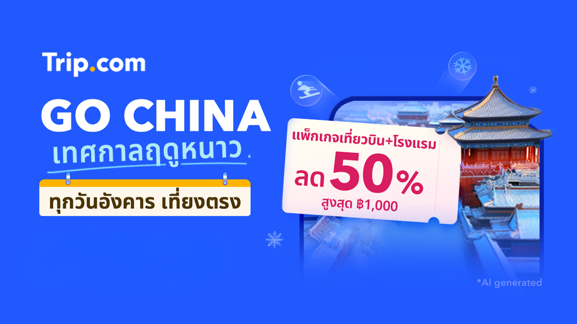 Trip.com เปิดตัวแคมเปญพิเศษ “Go China” สำหรับผู้ที่กำลังวางแผนเดินทางไปประเทศจีน มอบดีลพิเศษทั้งเที่ยวบิน ที่พัก และตั๋วเข้าสถานที่ท่องเที่ยวยอดนิยมทั่วประเทศจีน โดยโปรโมชั่นจะจัดขึ้นทุกวันอังคารตลอดปี 2568 พร้อมข้อเสนอที่แตกต่างกันในแต่ละเดือน ดูรายละเอียดเพิ่มเติมได้ที่ https://th.trip.com/sale/w/19280/gochina.html?locale=en-TH&promo_referer=4863_19280_1
