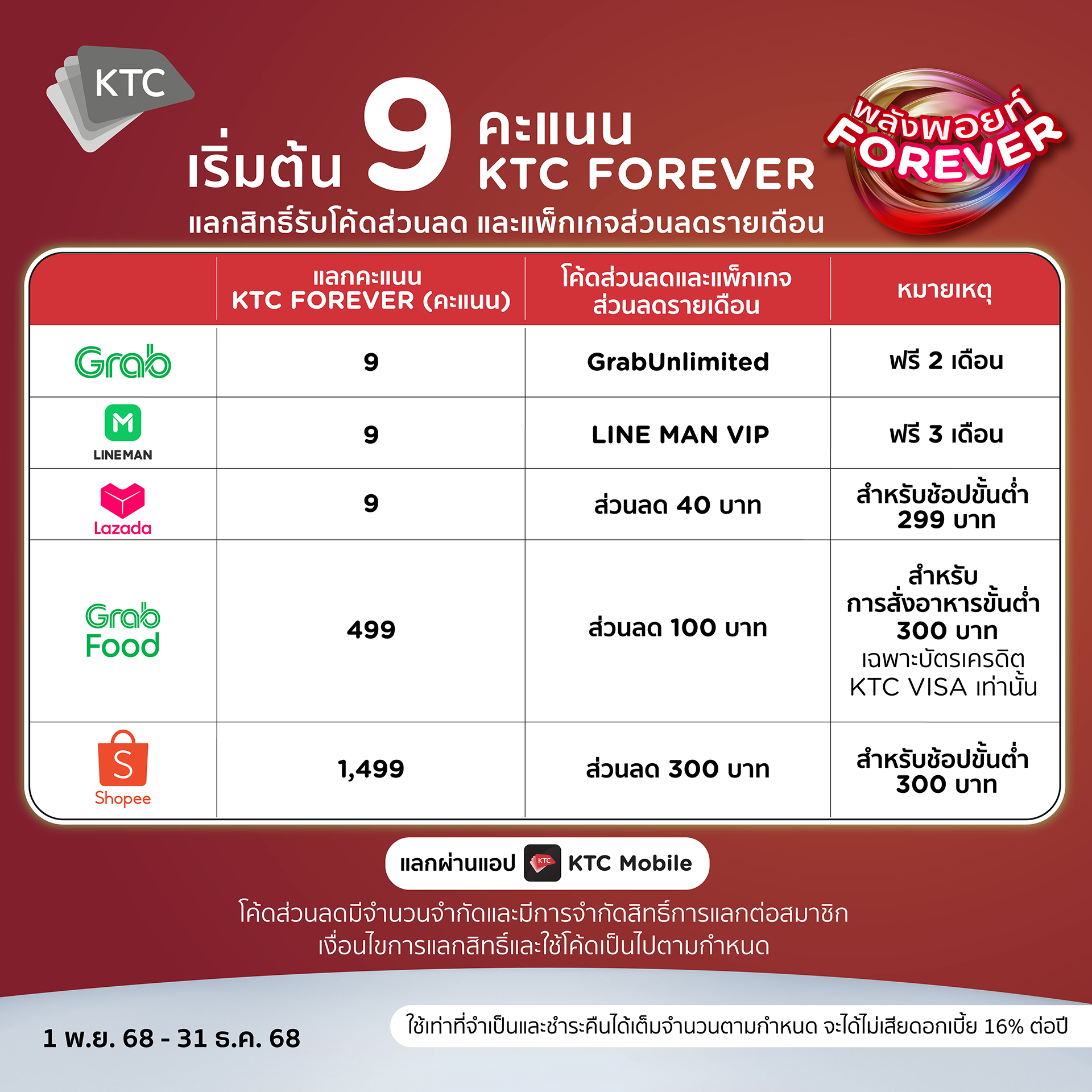 “เคทีซี” หรือ บริษัท บัตรกรุงไทย จำกัด (มหาชน) ร่วมกับแพลตฟอร์มออนไลน์ชั้นนำ Shopee, Lazada, Grab และ LINE MAN ในแคมเปญ “พลังพอยท์ FOREVER แลกไม่หยุด คุ้มสุดทุกดีล” เปิดให้สมาชิกบัตรเครดิตเคทีซีใช้คะแนน KTC FOREVER แลกสิทธิ์รับโค้ดพิเศษ เริ่มต้นเพียง 9 คะแนน ผ่านแอปฯ KTC Mobile สะท้อนกลยุทธ์บริหารความสัมพันธ์ลูกค้า (CRM) ที่มุ่งเพิ่มมูลค่าจากฐานสมาชิกเดิม พร้อมเสริม Loyalty Ecosystem ผ่านการใช้ดิจิทัลแพลตฟอร์มอย่างมีประสิทธิภาพ