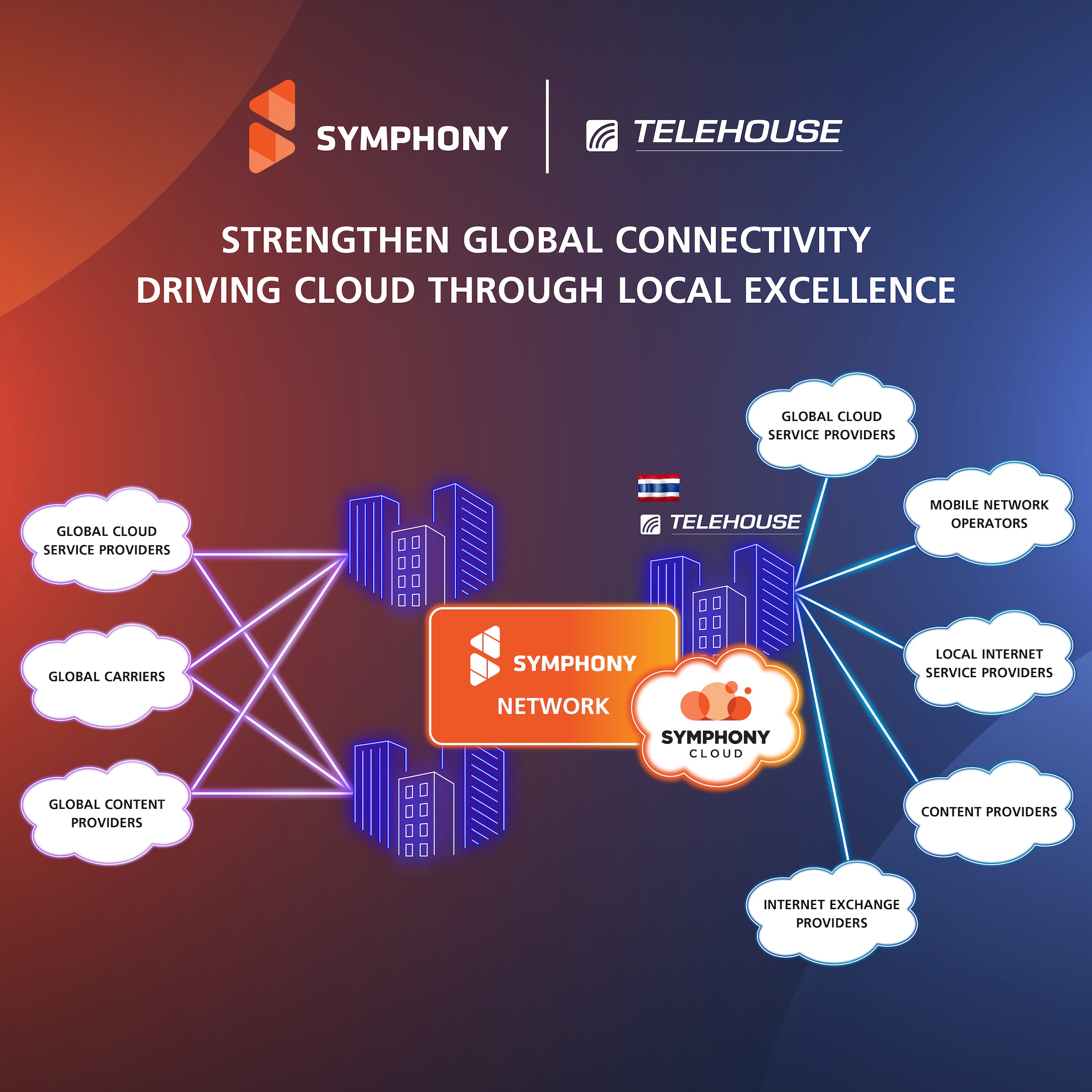 การร่วมมือครั้งนี้ SYMPHONY ผสานรวมโครงข่ายไฟเบอร์ออฟติกที่มีประสิทธิภาพสูง โครงข่ายอินเทอร์เน็ต และโครงข่ายเคเบิลใต้น้ำ ซึ่งครอบคลุมทั้งภายในประเทศและระหว่างประเทศ เข้ากับศูนย์รับฝากข้อมูลระดับโลกของ Telehouse เพื่อสร้างการเชื่อมต่อข้ามพรมแดนอย่างไร้รอยต่อระหว่างประเทศไทย อาเซียน และศูนย์กลางดิจิทัลระดับนานาชาติ อาทิ ญี่ปุ่น สิงคโปร์ ฮ่องกง และยุโรป