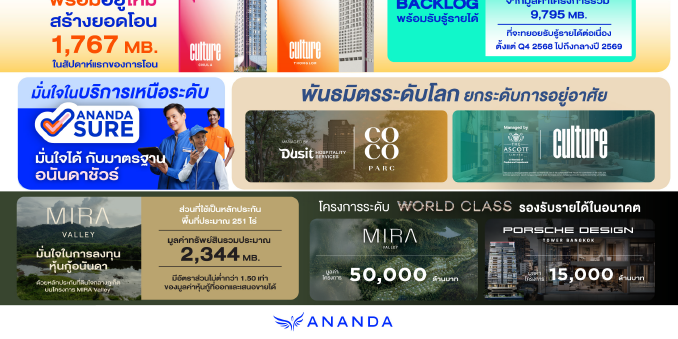 บริษัท อนันดา ดีเวลลอปเม้นท์ จำกัด (มหาชน) หรือ ANAN ผู้นำแห่งวงการพัฒนาที่อยู่อาศัยสำหรับคนเมือง ครองตำแหน่งผู้นำตลาดคอนโดมิเนียมติดรถไฟฟ้า มุ่งมั่นพัฒนาที่อยู่อาศัยเพื่อตอบโจทย์ชีวิตคนเมืองได้อย่างลงตัวที่สุด สร้างความแข็งแกร่งในการดำเนินงานต่อเนื่อง เดินหน้าสร้างผลงานยอดเยี่ยม จากการเริ่มโอนกรรมสิทธิ์ของ 2 โครงการใหม่ ได้แก่ คัลเจอร์ ทองหล่อ และ คัลเจอร์ จุฬา ส่งผลให้ในไตรมาส 3 ปี 2568 บริษัทฯ มียอดโอนรวมถึง 3,491 ล้านบาท เพิ่มขึ้นถึง 132% เมื่อเทียบกับไตรมาสก่อนหน้า และสามารถทำกำไรสุทธิ กว่า 130 ล้านบาท เติบโต 380% จากช่วงเดียวกันของปีก่อน รวมกำไรสุทธิในช่วง 9 เดือนแรกของปีอยู่ที่ กว่า 179 ล้านบาท