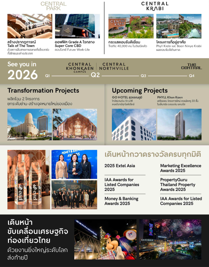 นอกจากนี้ ยังเดินหน้าโปรเจ็กต์พลิกโฉม Transformation อีก 2 โครงการ ยกระดับย่าน-สร้างจุดหมายใหม่ของเมือง ได้แก่ เซ็นทรัล ปิ่นเกล้า ภายใต้คอนเซปต์ New Soul of Pinklao และเซ็นทรัล เชียงใหม่ แอร์พอร์ต ภายใต้คอนเซปต์ Reimagining Lanna, พร้อม Upcoming Projects ได้แก่ GO HOTEL Bangkok Suvarnabhumi Airport ใกล้สนามบิน 10 นาที ตอบโจทย์ทุกไลฟ์สไตล์ เปิดตัว ไตรมาส 4/2568 และ Phyll Khon Kaen โครงการใหม่ คอนโดหรู 33 ชั้น ในเซ็นทรัล ขอนแก่น แคมปัส เปิดขายปี 2569