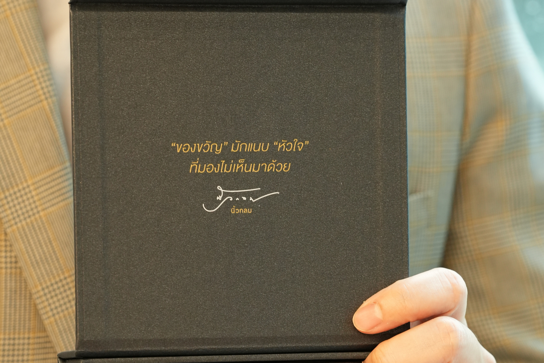 ภายในกล่องยังแฝงไว้ด้วยถ้อยคำที่สร้างสรรค์ด้วยแรงบันดาลใจจาก ‘นิ้วกลม’ ที่ถ่ายทอดพลังแห่งการให้จากใจได้อย่างงดงาม สื่อถึง “ของขวัญมักแนบหัวใจที่มองไม่เห็นมาด้วย” มาพร้อมกับ “เล็กน้อย ด้วยรัก นั้นยิ่งใหญ่” ทุกถ้อยคำสะท้อนคุณค่าของการมอบสิ่งดี ๆ จากใจ ที่แม้จะดูเรียบง่ายหรือชิ้นเล็ก แต่เปี่ยมไปด้วยความอบอุ่น ความจริงใจ และความหมายลึกซึ้ง เหมือนทองคำแท่งเล็ก ๆ ที่ส่องประกายแห่งคุณค่าและความปรารถนาดีจากผู้ให้ถึงผู้รับอย่างงดงาม