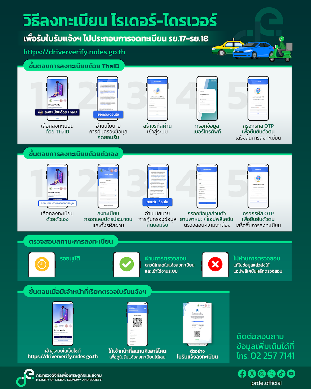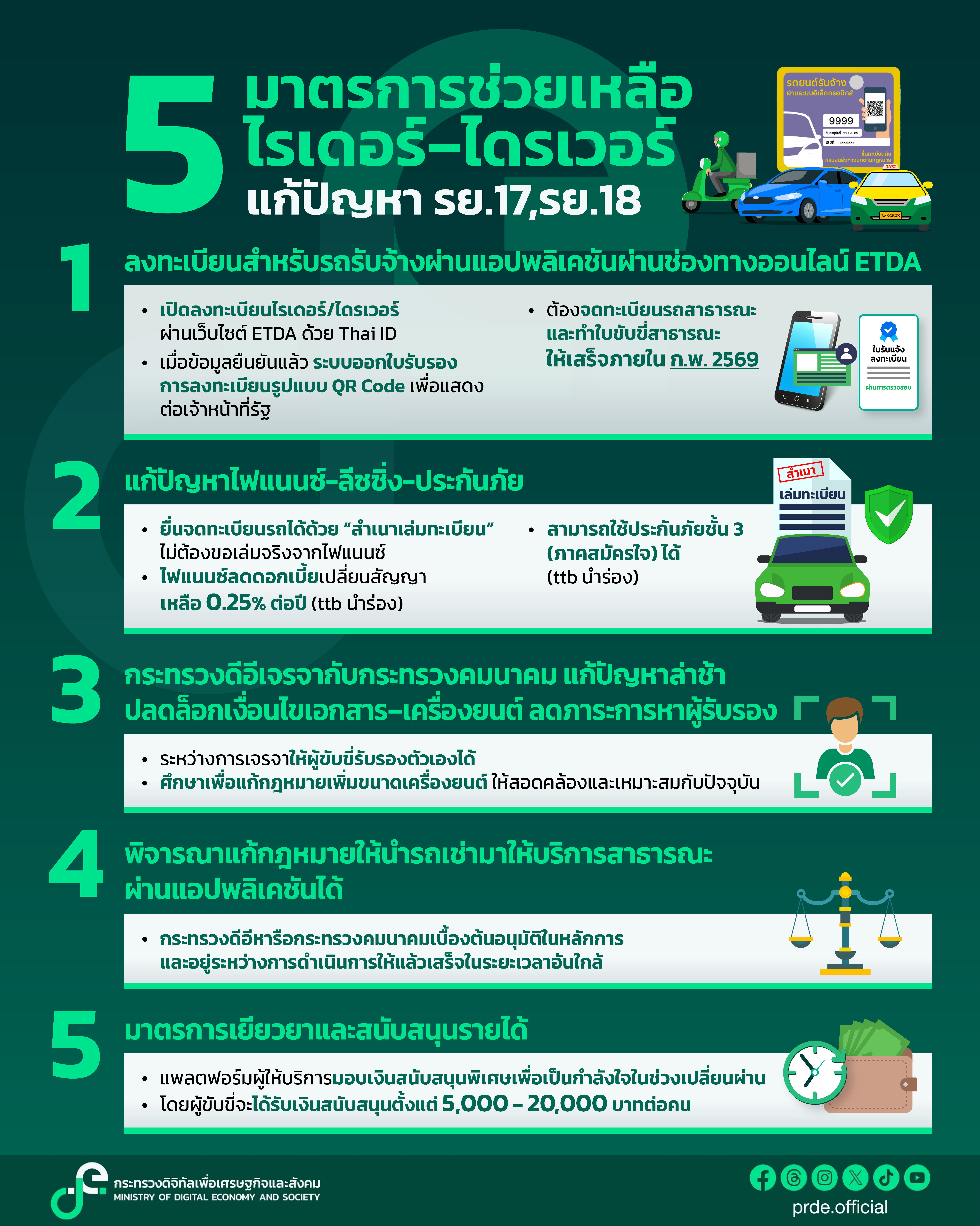 “ประกาศเรื่องรถรับจ้างผ่านระบบอิเล็กทรอนิกส์ (รย.17 และ รย.18) ส่งผลกระทบโดยตรงต่อผู้ขับขี่กว่า 200,000 รายที่เป็นฟันเฟืองสำคัญของเศรษฐกิจดิจิทัล กระทรวงฯ รับทราบถึงข้อกังวลและอุปสรรคหน้างาน ทั้งเรื่องเอกสารสิทธิ์ รถติดไฟแนนซ์ ค่าใช้จ่ายประกันภัยที่สูงขึ้น รวมถึงข้อจำกัดทางเทคนิคต่างๆ หลังจากรับข้อร้องเรียนมาแล้ว กระทรวงดีอีจึงไม่ได้นิ่งนอนใจและได้เร่งหารือกับกรมการขนส่งทางบก, ETDA สถาบันการเงิน และภาคเอกชน จนได้แนวทางแก้ไขปัญหาเร่งด่วน 5 มาตรการ เพื่อช่วยปลดล็อกผู้ประกอบอาชีพขับรถรับจ้างผ่านแอปพลิเคชันให้สามารถเข้าสู่ระบบได้อย่างถูกต้องและเป็นธรรม”