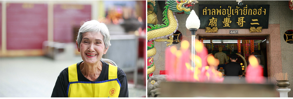 “เมื่อก่อนทำงานอยู่สถานีตำรวจด้านล่าง เมื่อเกษียณแล้วจึงมาสมัครทำงานที่ศาลพ่อปู่แห่งนี้ โดยมีหน้าที่แนะนำวิธีการสักการะบูชาพ่อปู่เจ้ายี่กอฮงและขายชุดไหว้ แม้จะไม่ใช่คนที่อาศัยอยู่แถวนี้แต่ก็ผูกพันกับย่านนี้ มองเห็นการเปลี่ยนแปลงมาหลายสิบปี ไม่ว่าจะเป็นช่วงเฟื่องฟูมาก หรือช่วงเงียบเหงา แต่เยาวราชก็ยังคงเอกลักษณ์ของความเป็นเยาวราชอยู่เสมอ ช่วงเทศกาลปีใหม่ และตรุษจีนย่านนี้จะคึกคักเป็นพิเศษ เพราะความเชื่อและความศรัทธาทำให้ เยาวราชกลายเป็นจุดหมายปลายทางของผู้คน และเชื่อว่าไม่ว่าจะผ่านไปกี่ยุคสมัยเสน่ห์ของเยาวราชจะยังไม่จางหายไป”
