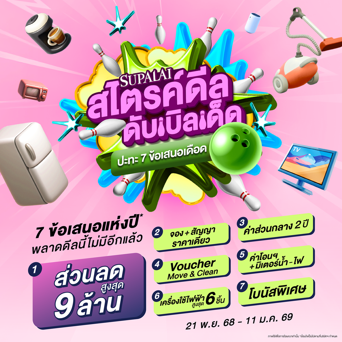 แคมเปญ “SUPALAI สไตรค์ดีลดับเบิลเด็ด ปะทะ 7 ข้อเสนอเดือด” จัดตั้งแต่วันที่ 21 พฤศจิกายน 2568 – 11 มกราคม 2569 ณ สำนักงานขายศุภาลัยทั่วประเทศ หรือค้นหาโครงการที่เข้าร่วมได้ทาง
