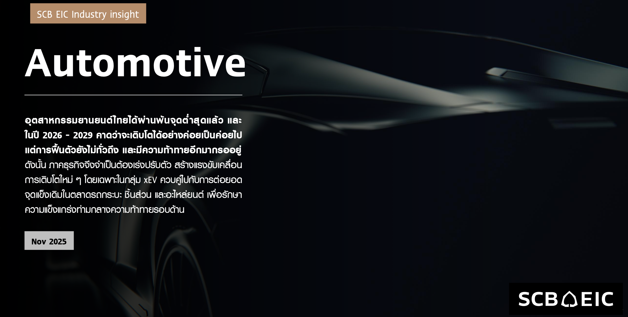 อุตสาหกรรมยานยนต์ไทยส่งสัญญาณ “ผ่านจุดต่ำสุดแล้ว” ในปี 2568 แต่เส้นทางข้างหน้ายังอีกไกลกว่าจะฟื้นตัวอย่างแข็งแรง การเติบโตในช่วงปี 2569–2572 จะมาแบบค่อยเป็นค่อยไป และกระจุกตัวในบางเซกเมนต์ โดยเฉพาะ ยานยนต์ไฟฟ้า xEV และรถ SUV ที่สอดรับกับความนิยมผู้บริโภค แต่ผู้ผลิตที่พึ่งพารถสันดาป (ICE) และตลาดส่งออกเป็นหลักยังต้องเผชิญความเสี่ยงรอบด้าน