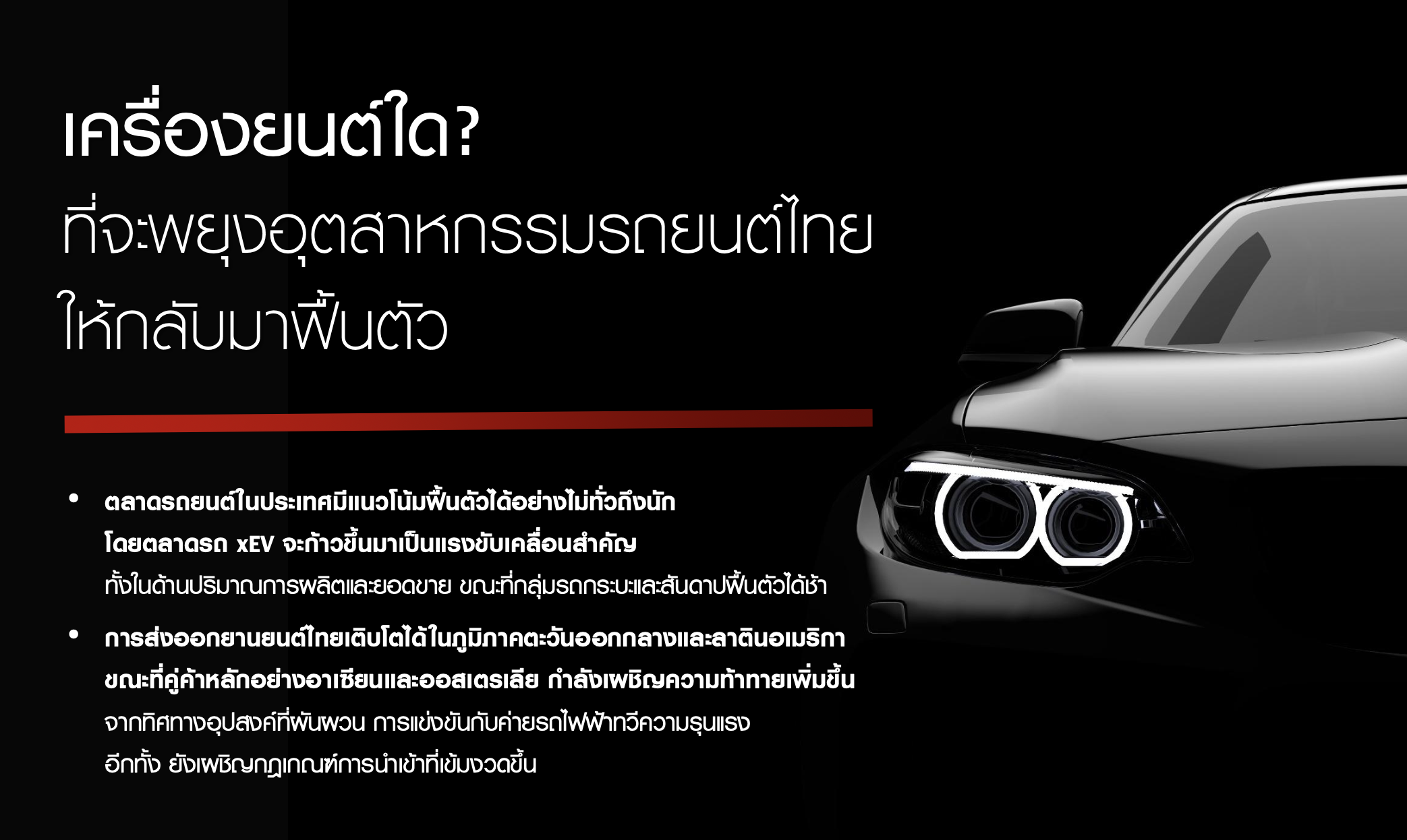 → ผู้ชนะยุคใหม่ = ค่ายที่ปรับพอร์ตสู่ xEV, SUV, พัฒนาซัพพลายเชนให้แข่งขันสากล พร้อมรับแรงกดดันทางการค้าระหว่างประเทศ