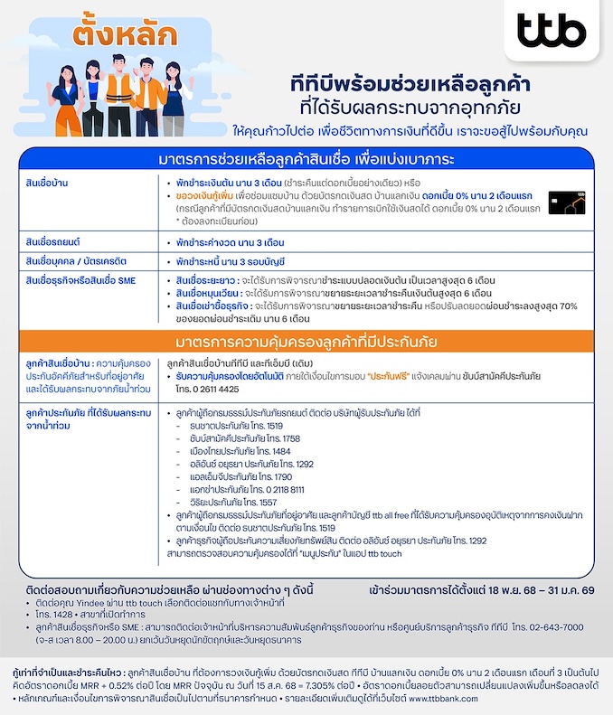 นายปิติ ตัณฑเกษม ประธานเจ้าหน้าที่บริหาร ทีเอ็มบีธนชาต กล่าวว่า ธนาคารมีความห่วงใยลูกค้าที่ได้รับผลกระทบจากสถานการณ์น้ำท่วม ซึ่งส่งผลกระทบเป็นวงกว้างก่อให้เกิดความเสียหายต่อบ้านเรือนที่อยู่อาศัย ทรัพย์สิน และสถานประกอบธุรกิจ ทำให้มีภาระค่าใช้จ่ายเพิ่มขึ้น จึงได้ออกมาตรการ “ตั้งหลัก” เพื่อบรรเทาความเดือดร้อนที่เกิดขึ้นอย่างเร่งด่วน หวังให้ลูกค้าสามารถฟื้นตัว กลับมาตั้งหลักและก้าวเดินต่อไปสู่การมีชีวิตทางการเงินที่ดีขึ้น สามารถเข้าร่วมมาตรการได้ตั้งแต่วันที่ 18 พ.ย. 2568 - 31 ม.ค. 2569 โดยมีรายละเอียดของมาตรการดังนี้