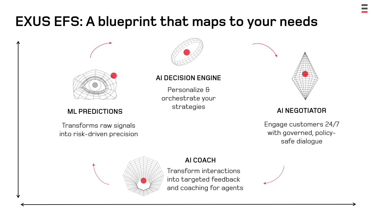 ปัจจุบัน EXUS ยังอยู่ในระยะพัฒนานวัตกรรมใหม่อีกหลายด้าน เช่น การสร้างกลยุทธ์ผ่านภาษาธรรมชาติ (Natural Language) โดยไม่ต้องเขียนกฎเอง การใช้ GenAI ตรวจสอบความสอดคล้องกับกฎ ธนาคารแห่งประเทศไทยก่อนใช้งานจริง และระบบเชื่อมโยงข้อมูลทุกแพลตฟอร์มให้ทำงานร่วมกันได้อย่างไร้รอยต่อ ซึ่งจะช่วยยกระดับประสิทธิภาพการบริหารหนี้ของสถาบันการเงินไทยให้เทียบเท่ามาตรฐานโลกในอนาคตอันใกล้