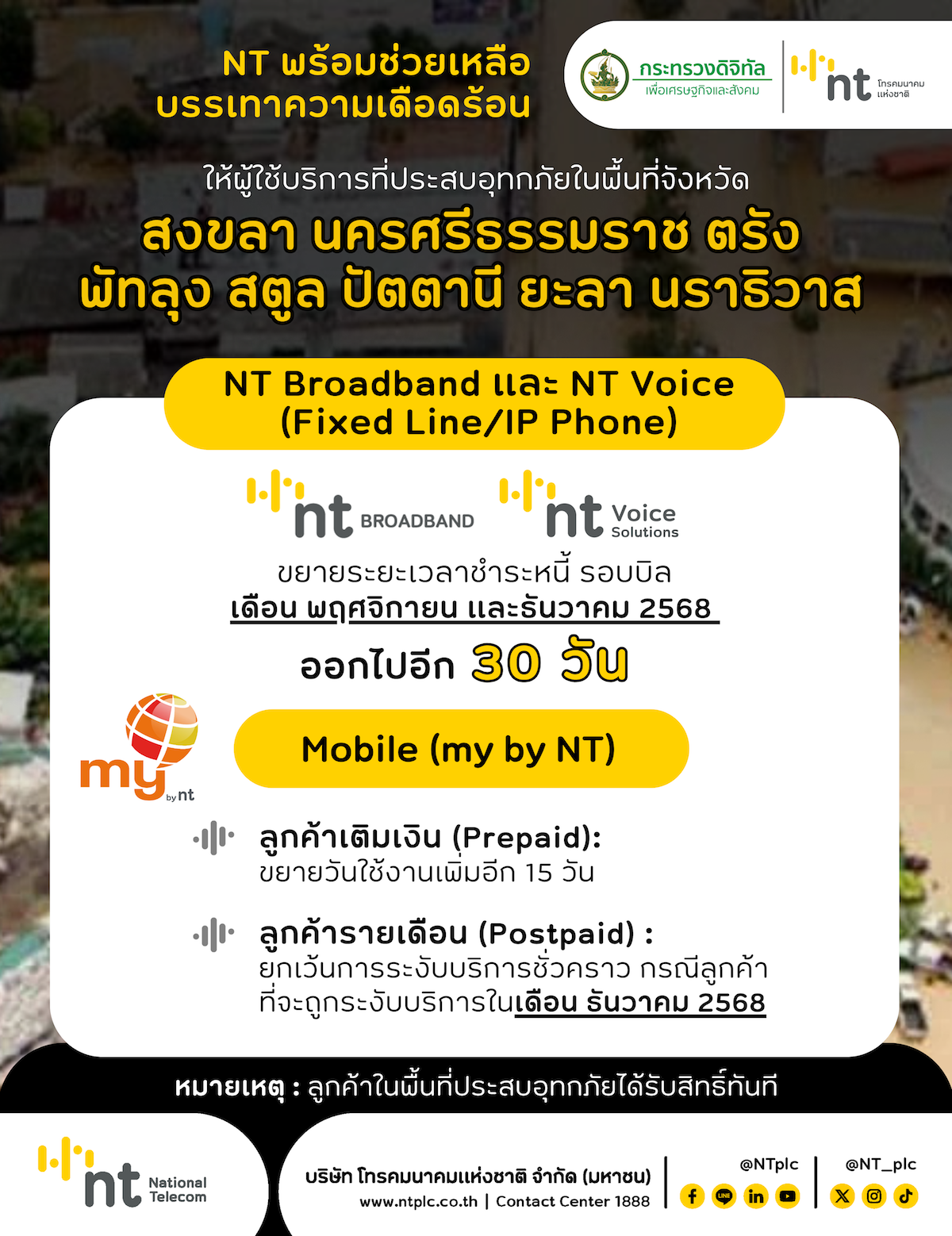 ทั้งนี้ในส่วนของการดูแลลูกค้าในพื้นที่ประสบอุทกภัย NT ได้จัดทีมช่างเข้าดูแลคุณภาพโครงข่ายการสื่อสาร รวมถึงการให้บริการเพื่อให้ประชาชนสามารถติดต่อสื่อสารและเข้าถึงบริการพื้นฐานได้ด้วยความสะดวกอย่างต่อเนื่อง พร้อมจัดมาตรการเยียวยาลูกค้าที่ใช้บริการ NT Voice (Fixed Line /IP Phone) บริการอินเทอร์เน็ตความเร็วสูง (FTTx) และบริการ NT Mobile (my) ที่จดทะเบียนอยู่ในเขตพื้นที่อำเภอหาดใหญ่ จังหวัดสงขลา นครศรีธรรมราช ตรัง พัทลุง สตูล ปัตตานี ยะลา นราธิวาส และพื้นที่จังหวัดอื่น ๆ ที่อาจเกิดอุทกภัยน้ำท่วมเพิ่มเติมในปี 2568 ประกอบด้วย