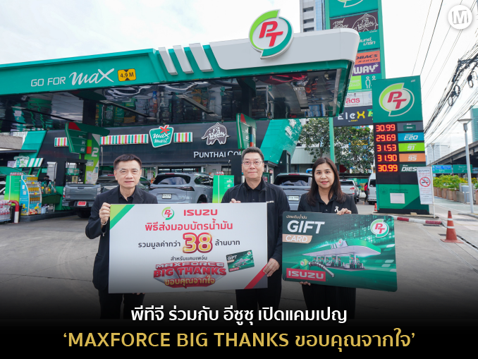 บริษัท พีทีจี เอ็นเนอยี จำกัด (มหาชน) หรือ PTG ผู้นำด้านพลังงานและเครือข่ายสถานีบริการน้ำมันพีที (PT) ที่ครอบคลุมทั่วประเทศ ร่วมกับบริษัท ตรีเพชรอีซูซุเซลส์ จำกัด ผู้นำตลาดรถยนต์เมืองไทย มอบความขอบคุณครั้งใหญ่แก่ลูกค้าผ่านแคมเปญ “MAXFORCE BIG THANKS ขอบคุณจากใจ” เพียงซื้อและรับรถปิกอัพ อีซูซุดีแมคซ์ หรือรถยนต์นั่งอเนกประสงค์มิว-เอ็กซ์ ทุกรุ่น จากโชว์รูมอีซูซุทั่วประเทศ ระหว่างวันที่ 25 ตุลาคม – 30 ธันวาคม 2568 รับสิทธิ์ลุ้นรับบัตรน้ำมัน PT รางวัลใหญ่สุด 9 รางวัล มูลค่ารางวัลละ 175,000 บาท และรางวัลบัตรน้ำมันอื่น ๆ รวมจำนวน 1,907 รางวัล รวมมูลค่ากว่า 38.7 ล้านบาท การผนึกกำลังครั้งนี้สะท้อนวิสัยทัศน์ร่วมของทั้งสององค์กรในการส่งมอบความคุ้มค่าและความสะดวกสบายให้กับผู้ใช้รถยนต์ชาวไทย รวมถึงขอบคุณเสียงตอบรับความสำเร็จของเครื่องยนต์ 2.2 Ddi MAXFORCE หนึ่งเดียวที่พิสูจน์จากระยะการใช้งานรวมกันของลูกค้ากว่า 222 ล้านกิโลเมตร ตลอดจนตอกย้ำความมุ่งมั่นในการเป็น “พลังขับเคลื่อนทุกมิติของชีวิตผู้ใช้รถยนต์” อย่างแท้จริง