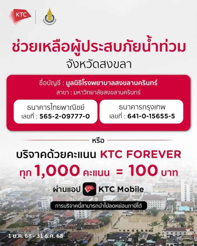 “เคทีซี” หรือ บริษัท บัตรกรุงไทย จำกัด (มหาชน) ชวนสมาชิกบัตรฯ ร่วมสมทบทุนช่วยเหลือผู้ประสบอุทกภัยในภาคใต้ ผ่านสภากาชาดไทย มูลนิธิโรงพยาบาลสงขลานครินทร์ และมูลนิธิรักษ์ไทย โดยสามารถเลือกชำระเงินบริจาคด้วยบัตรเครดิตเคทีซีที่มูลนิธิฯ หรือใช้คะแนน KTC FOREVER ทุก 1,000 คะแนนแทนเงินบริจาค 100 บาท ผ่านแอป KTC Mobile เพื่อช่วยสนับสนุนการจัดหาอาหาร ยารักษาโรค อุปกรณ์ ยังชีพ และการฟื้นฟูพื้นที่ไปยังชุมชนที่กำลังเผชิญสถานการณ์อย่างเร่งด่วน