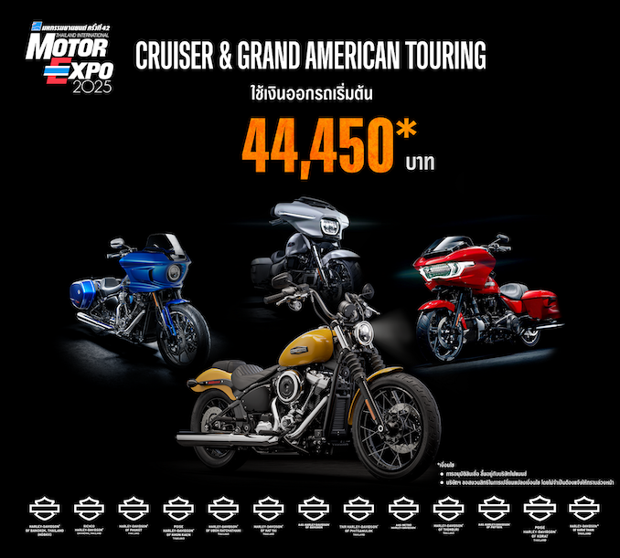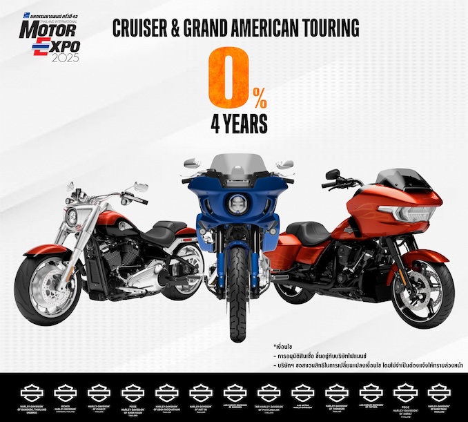 - Harley-Davidson – แคมเปญพิเศษสำหรับ Cruiser และ Grand American Touring เลือกระหว่างดาวน์ต่ำ / ดอกเบี้ย 0% / ผ่อนเริ่มต้น พร้อม Welcome Kit และประกันชั้นหนึ่ง 1 ปี