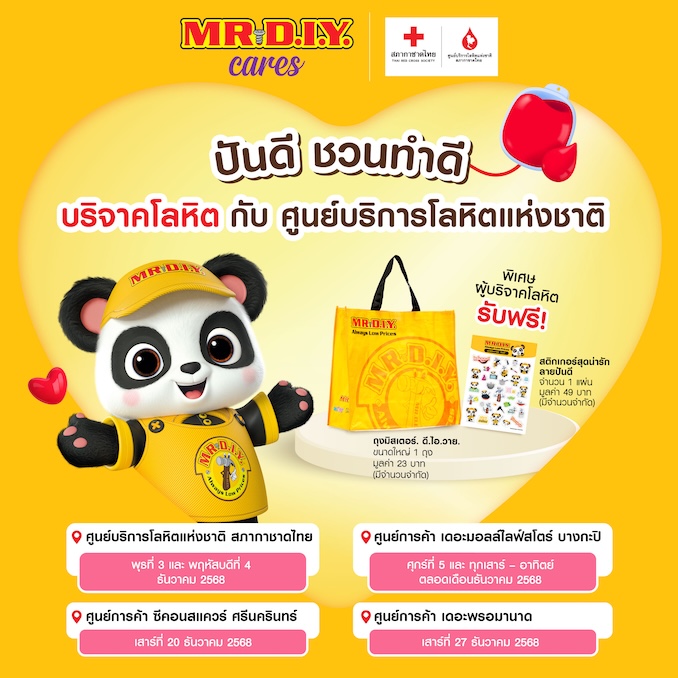 รวมถึงการจัดกิจกรรม “Troop เจอดีทั่วไทย ปันความสุขส่งท้ายปี”(5) พร้อมชวนทำดีบริจาคโลหิต” ร่วมกับสภากาชาดไทย(2) นำโดยมาสคอต “ปันดี” ที่เตรียมมอบรอยยิ้มไปสู่ลูกค้าในหลายพื้นที่ทั่วกรุงเทพฯ พร้อมกิจกรรมสนุก ๆ อีกมากมายและพิเศษสุดในช่วงวันที่ 20–28 ธันวาคม 2568 เพียงซื้อสินค้าใดก็ได้ครบ 300 บาท/ใบเสร็จ จะได้รับถุงชอปปิง MR. D.I.Y. ขนาดใหญ่ (L) มูลค่า 23 บาท ฟรี! จำกัด 100 ท่านแรกต่อวันต่อสาขา ใน 25 สาขา ในห้างสรรพสินค้าและซูเปอร์มาร์เก็ตชั้นนำที่ร่วมรายการ(6)