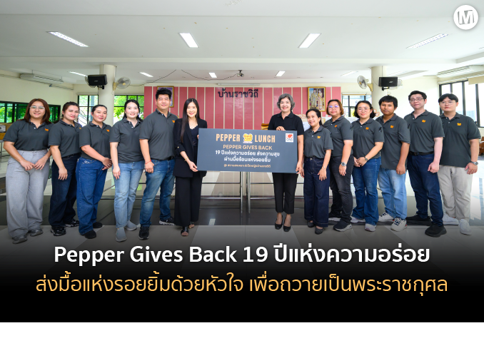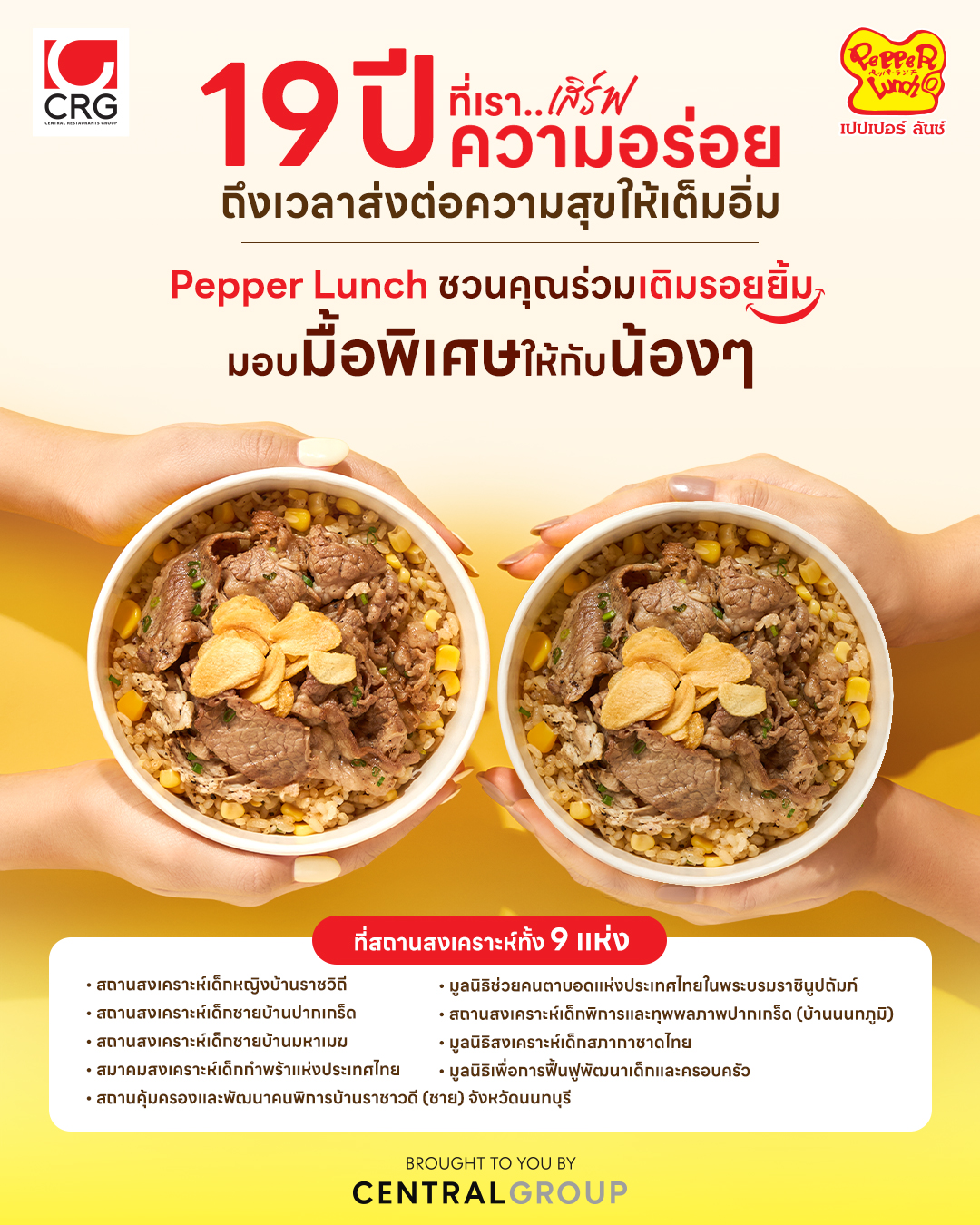 เปปเปอร์ ลันช์ (Pepper Lunch) ร้านสเต็กสไตล์ญี่ปุ่นชื่อดัง หนึ่งเดียวในประเทศไทย ภายใต้การบริหารโดย บริษัท เซ็นทรัล เรสตอรองส์ กรุ๊ป จำกัด (ซีอาร์จี) ฉลองครบรอบ 19 ปีแห่งความอร่อย “ทำร้อน เสิร์ฟร้อน ด้วยหัวใจ” เดินหน้าสานต่อเจตนารมณ์แห่งการ “ให้” ผ่านกิจกรรม “Pepper Gives Back” ส่งมอบความสุข และมื้อร้อนแห่งรอยยิ้มให้กับน้องๆ ในสถานสงเคราะห์ เพื่อถวายเป็นพระราชกุศล สมเด็จพระนางเจ้าสิริกิติ์ พระบรมราชินีนาถ พระบรมราชชนนีพันปีหลวง พระผู้เสด็จสู่สวรรคาลัย