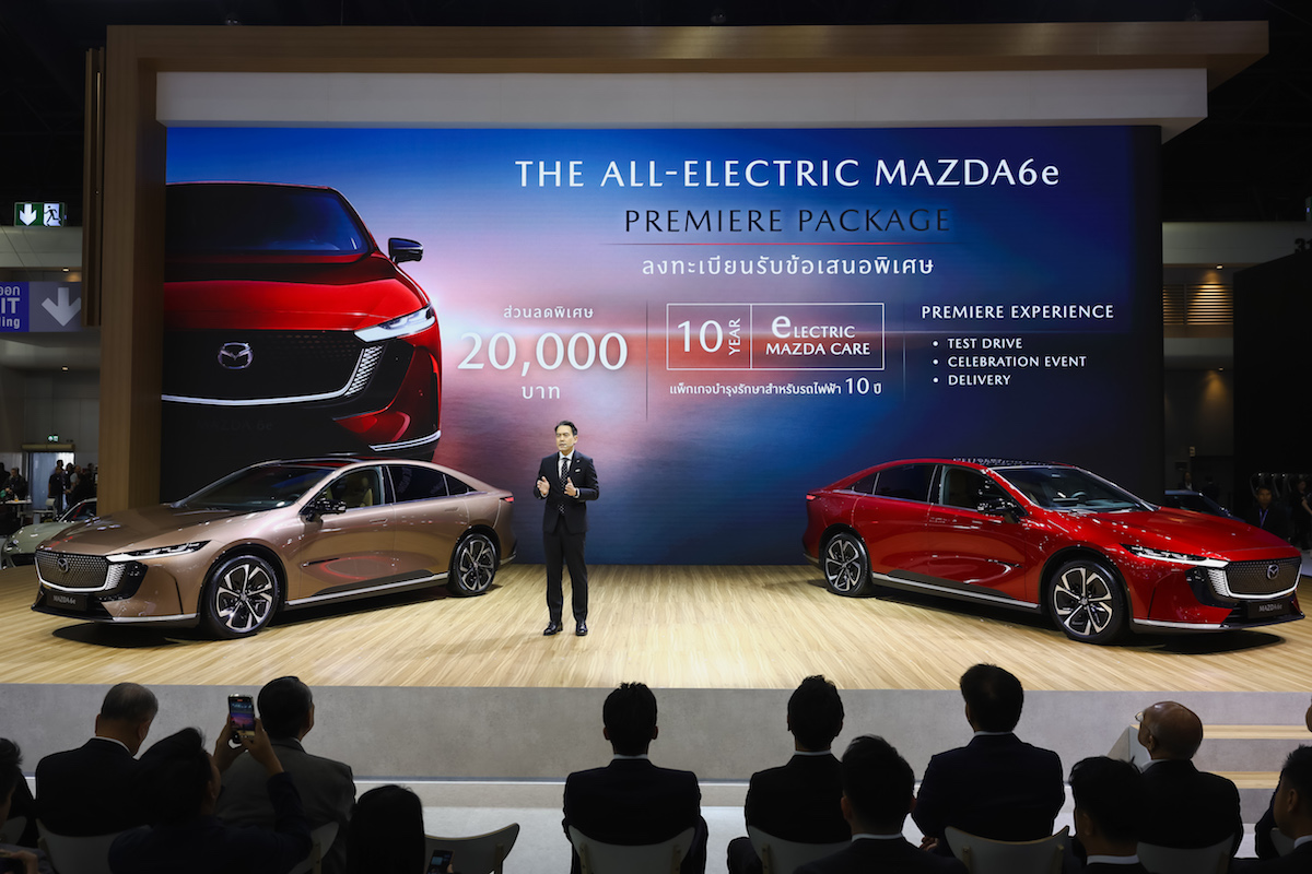หลังจากเปิดตัวแนะนำรถยนต์ไฟฟ้ารุ่นแรกในประเทศไทย The All-Electric Mazda6e พร้อมเปิดให้ผู้ที่สนใจลงทะเบียนจองสิทธิ์ Mazda6e Premiere Package* ซึ่งลูกค้าจะได้รับสิทธิพิเศษดังกล่าว มูลค่าสูงสุดถึง 70,000 บาท* (จำนวนจำกัด) โดยได้รับส่วนลดพิเศษ 20,000 บาท* แพ็กเกจบำรุงรักษารถ Electric Mazda Care นาน 10 ปี* ร่วมสัมผัสประสบการณ์สุดเอ็กซ์คลูซีฟกับ Mazda6e Premiere Experience ทั้งการทดลองขับ “Premiere Test Drive”, การเข้าร่วมงาน “Premiere Celebration Event” และสิทธิ์รับรถล็อตแรก “Premiere Delivery” โดยจองสิทธิ์ผ่านระบบออนไลน์รูปแบบใหม่บน Mazda Official Website ที่ https://www.mazda.co.th/th/mazda6e-pre-register และยังสามารถดูรายละเอียดรถได้จาก Mazda Virtual Showroom ได้เช่นกัน ภายในงานฯ มีลูกค้าให้ความสนใจแน่นบูธมาสด้าตลอดทั้งวัน
